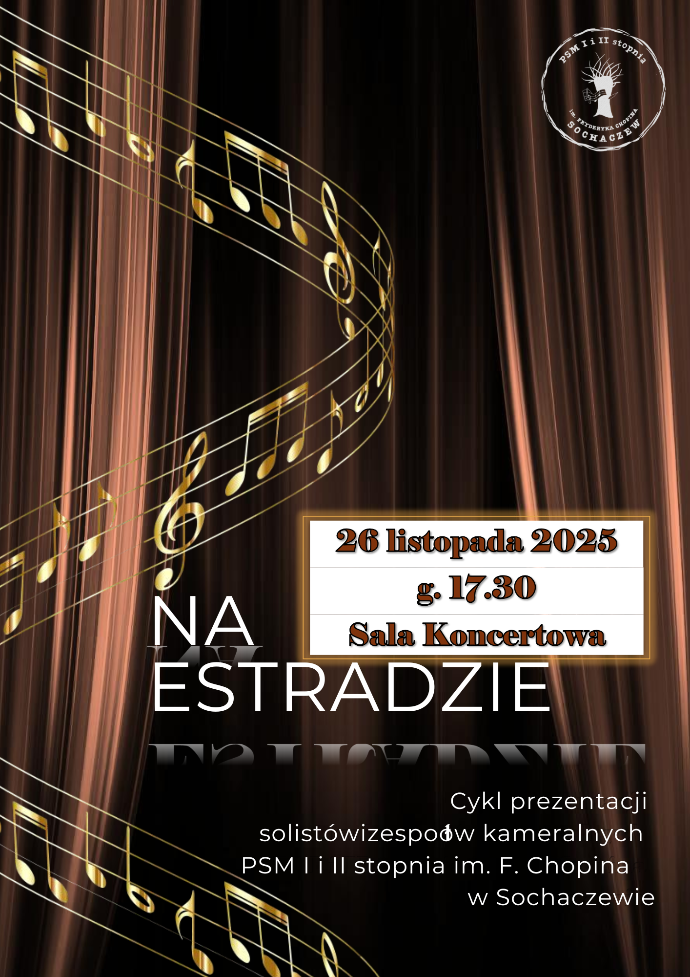 Zapraszamy na kolejny koncert z cyklu "Na estradzie", podczas którego wystąpią soliści i zespoły kameralne PSM I i II stopnia im. Fryderyka Chopina w Sochaczewie. Koncert odbędzie się 26 listopada br. o godz. 17.30 w Sali Koncertowej naszej szkoły.