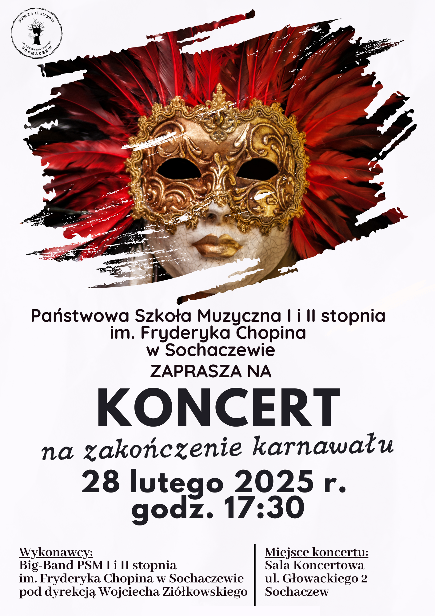 Zapraszamy na Koncert na zakończenie karnawału, który będzie doskonała okazją do wysłuchania utworów rozrywkowych i jazzowych w wykonaniu znakomitego Big-bandu Państwowej Szkoły Muzycznej I i II stopnia im. Fryderyka Chopina w Sochaczewie.