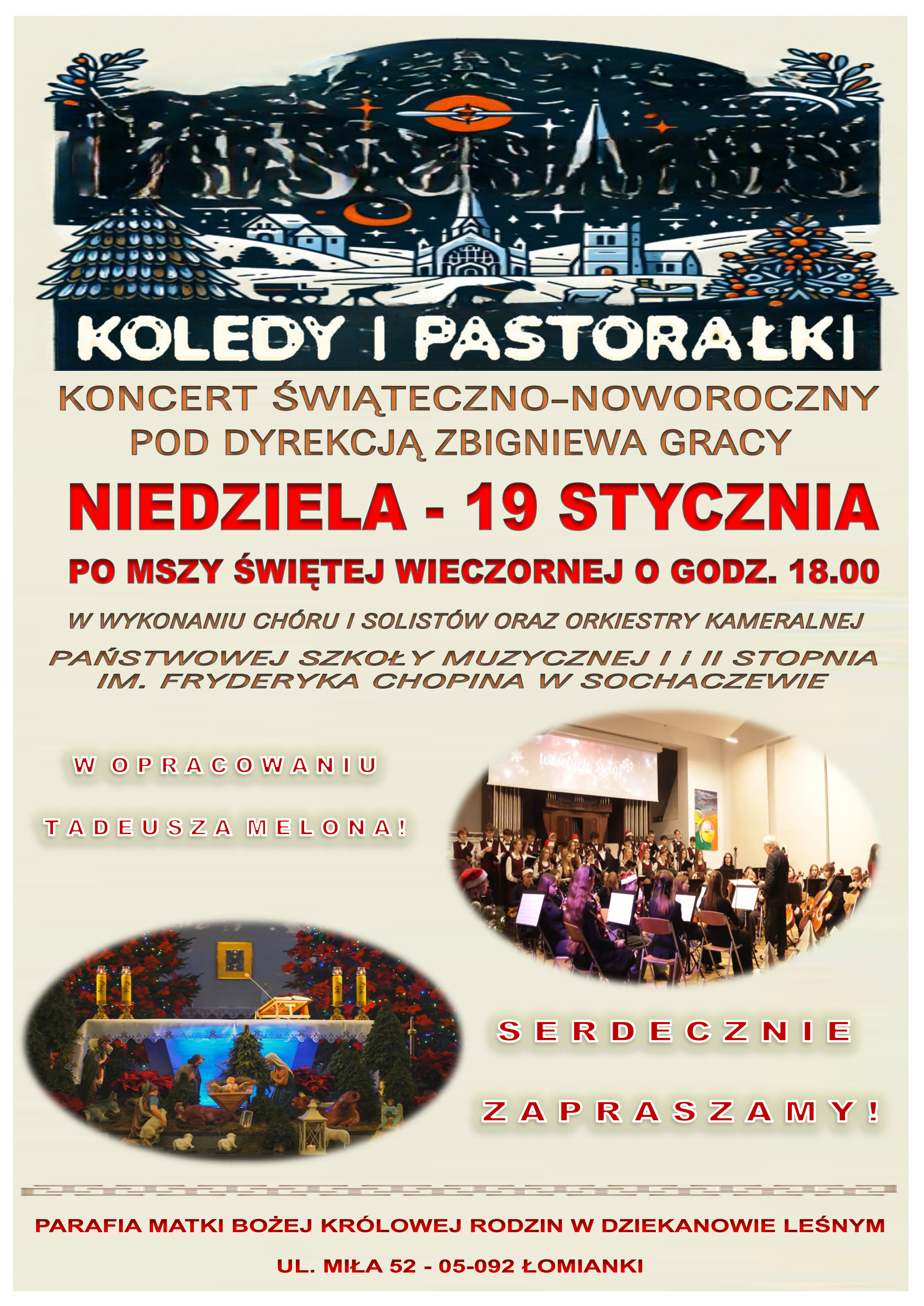 Państwowa Szkoła Muzyczna I i II stopnia im. Fryderyka Chopina w Sochaczewie na zaproszenie Parafii pw. Matki Bożej Królowej Rodzin pojawi się tam w najbliższą niedzielę, czyli 19 stycznia 2025 r.