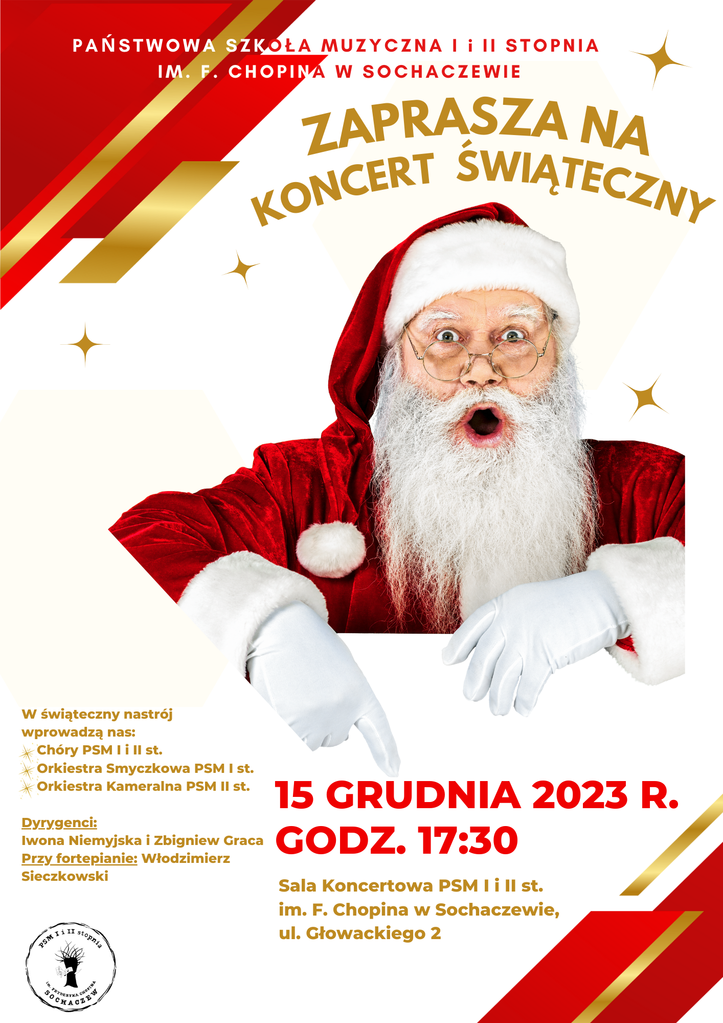 Zapraszamy na wyjątkowy Koncert Świąteczny do Państwowej Szkoły Muzycznej I i II stopnia w Sochaczewie. Wydarzenie odbędzie się 15 grudnia 2023 r. o godz. 17.30 w Sali Koncetowej naszej szkoły.