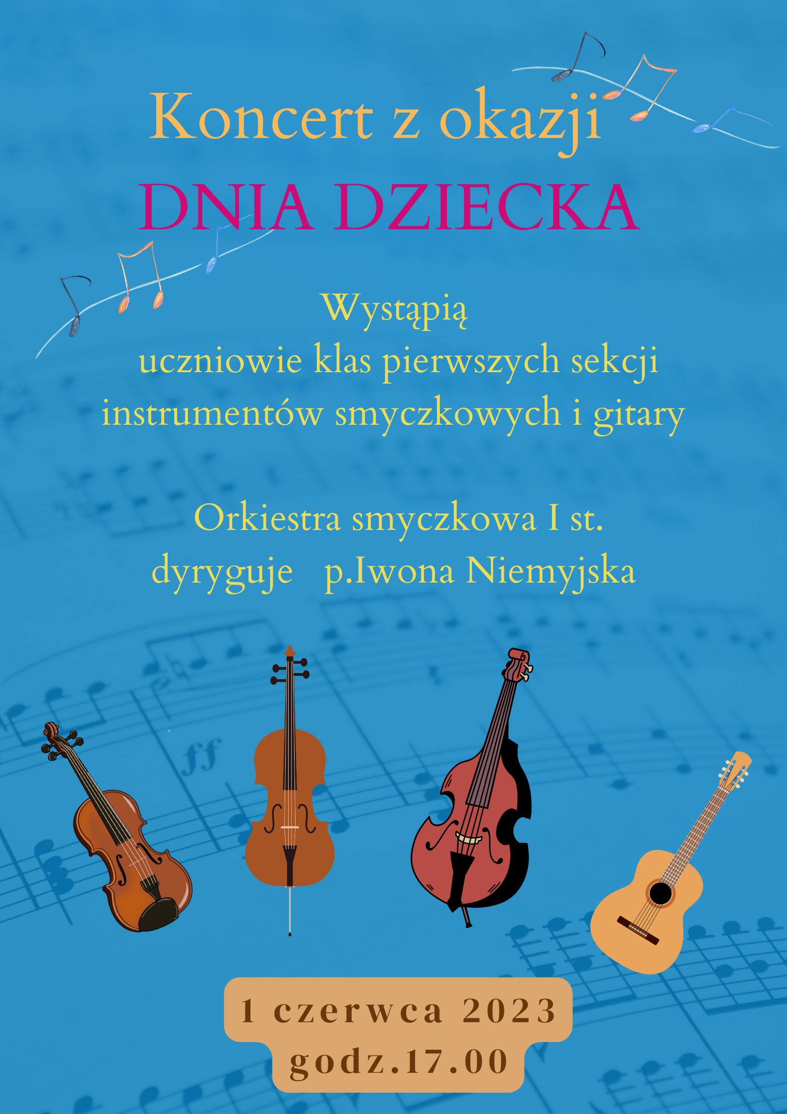 Zapraszamy Koncert z okazji Dnia Dziecka, podczas którego wystąpią uczniowie klas pierwszych sekcji instrumentów smyczkowych i gitary oraz Orkiestra smyczkowa I stopnia, którą prowadzi i dyryguje Iwona Niemyjska. Koncert odbędzie się 1 czerwca 2023 r. o godz. 17.00