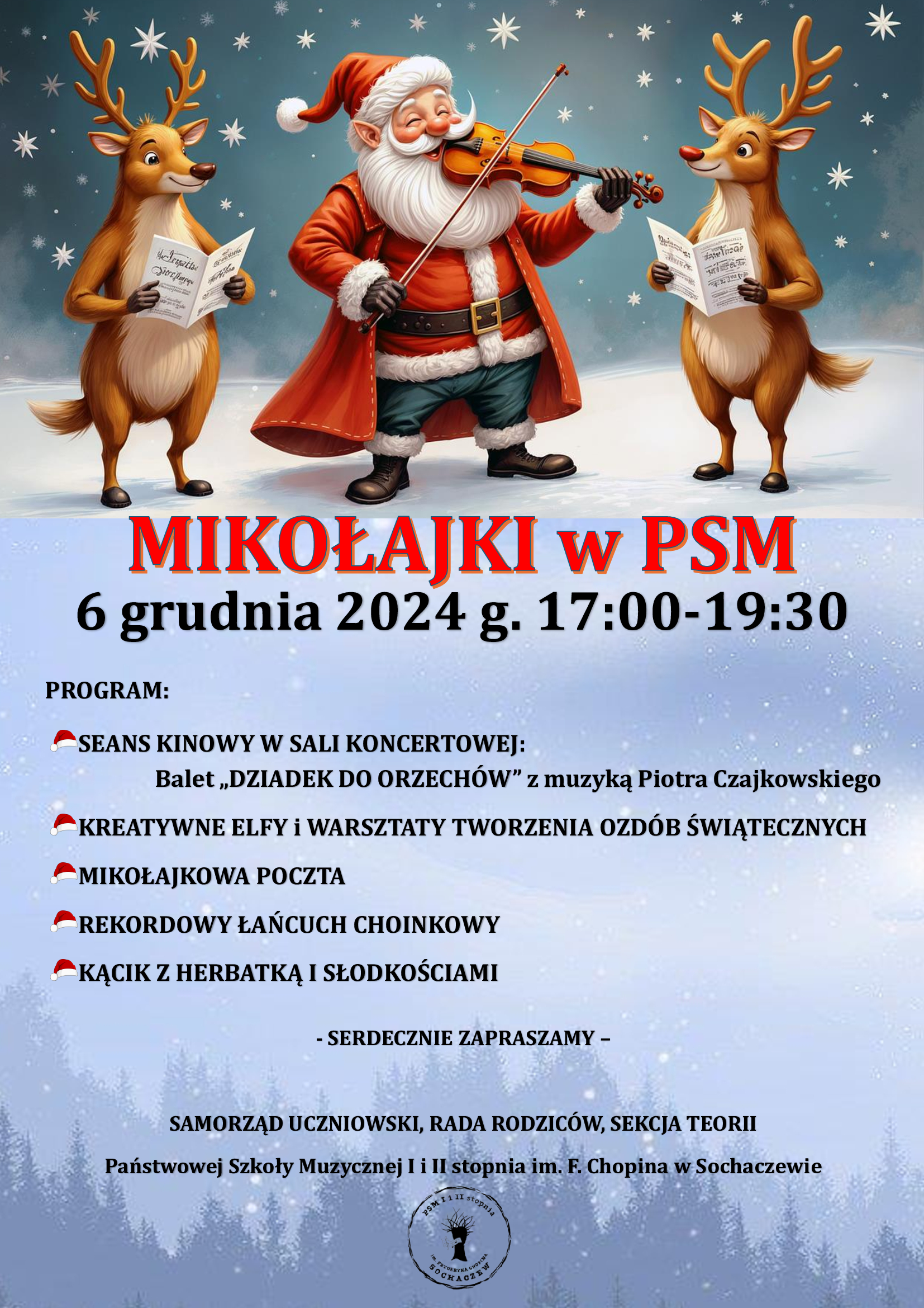 Samorząd Uczniowski, Rada Rodziców i Sekcja teorii zapraszają uczniów Państwowej Szkoły Muzycznej I i II stopnia im. Fryderyka Chopina na szkolne Mikołajki, które odbędą się 6 grudnia 2024 r. w godz. 17.00-19.30.