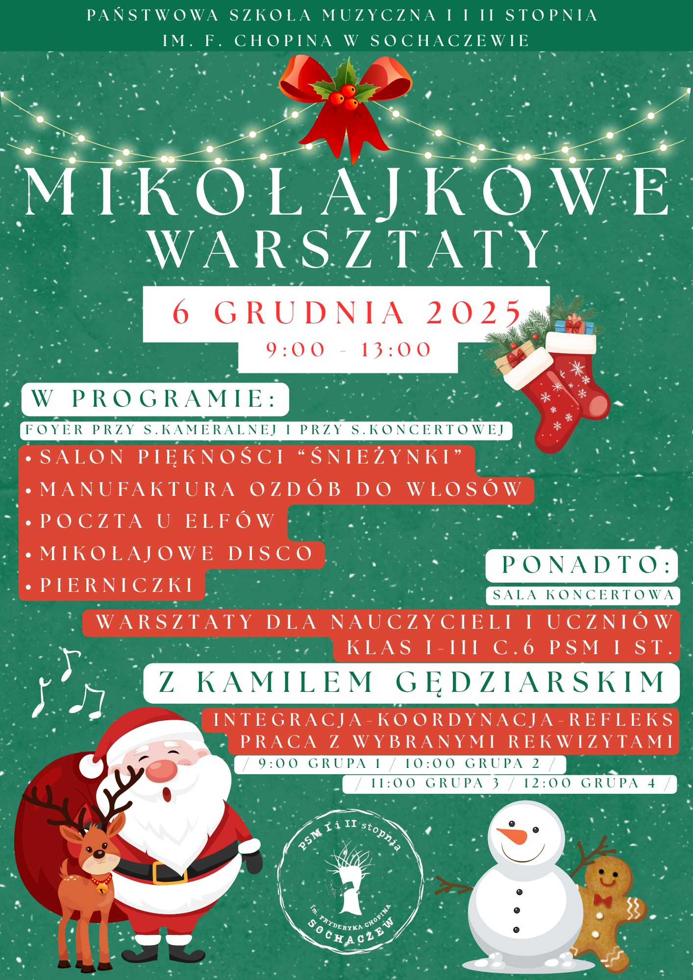 Mikołajki w Państwowej Szkole Muzycznej I i II stopnia im. Fryderyka Chopina w Sochaczewie będą w tym roku wyjątkowe! 6 grudnia 2025 r. w godz. od 9.00 do 13.00 odbędą się „Mikołajkowe warsztaty”. W programie wydarzenia: