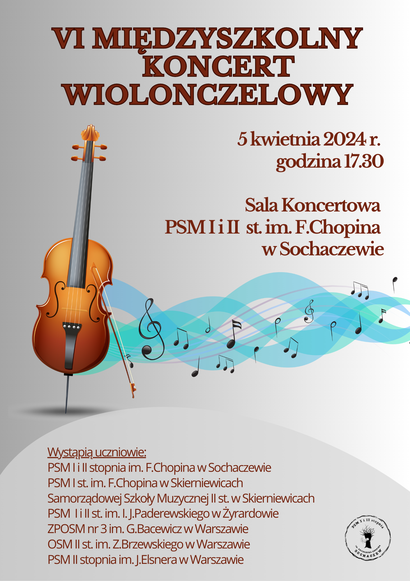 Zapraszamy na VI Międzyszkolny Koncert Wiolonczelowy, który odbędzie się 5 kwietnia 2024 r. o godz. 17:30 w Sali Koncertowej naszej szkoły. Podczas koncertu wystapią uczniowie zaprzyjaźnionych szkół: