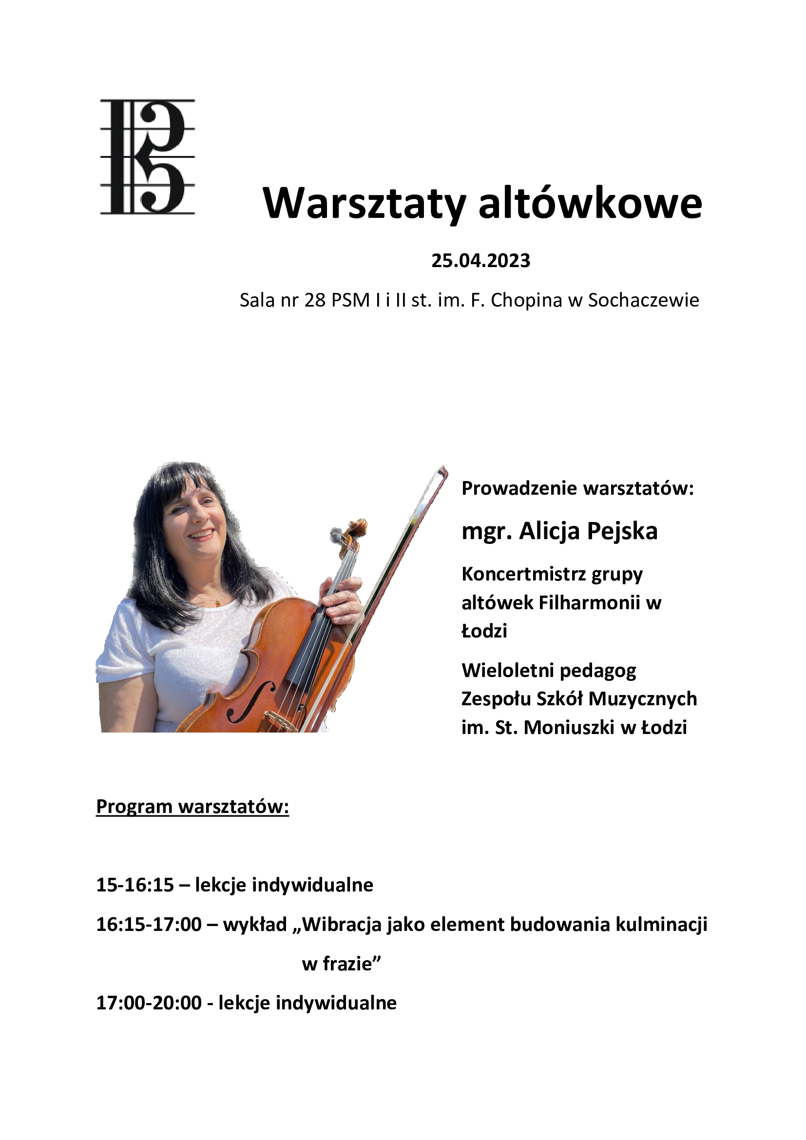 Prowadzenie warsztatów: mgr. Alicja Pejska Koncertmistrz grupy altówek Filharmonii w Łodzi oraz wieloletni pedagog Zespołu Szkół Muzycznych im. St. Moniuszki w Łodzi.