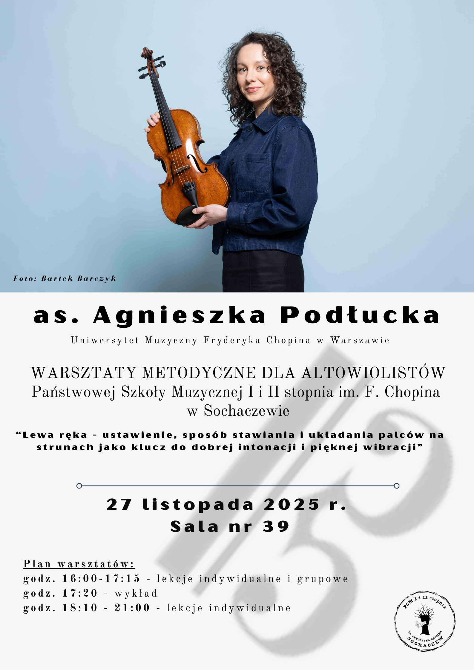 27 listopada 2025 r. odbęda się warsztaty metodyczne dla altowiolistów Państwowej Szkoły Muzycznej I i II stopnia im. F. Chopina w Sochaczewie, które poprowadzi as. Agnieszka Podłucka (UMFC). Temat warsztatów to “Lewa ręka - ustawienie, sposób stawiania i układania palców na strunach jako klucz do dobrej intonacji i pięknej wibracji”.