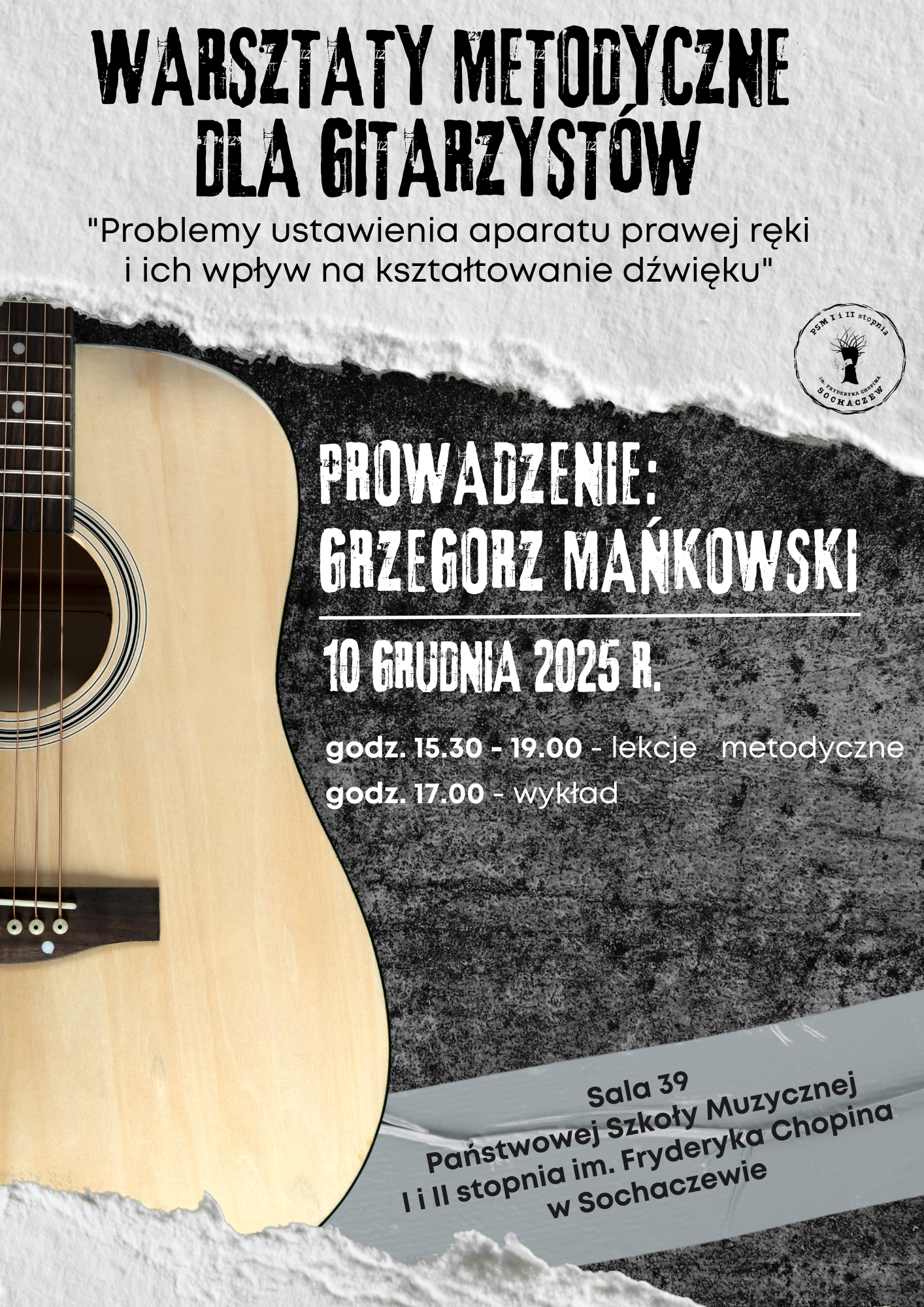 „Problemy ustawienia aparatu prawej ręki i ich wpływ na kształtowanie dźwięku” to temat zbliżających się warsztatów metodycznych dla nauczycieli i uczniów klas gitary naszej szkoły. Warsztaty, które odbędą się 10 grudnia 2025 r. w PSM I i II stopnia im. Fryderyka Chopina w Sochaczewie poprowadzi Grzegorz Mańkowski.