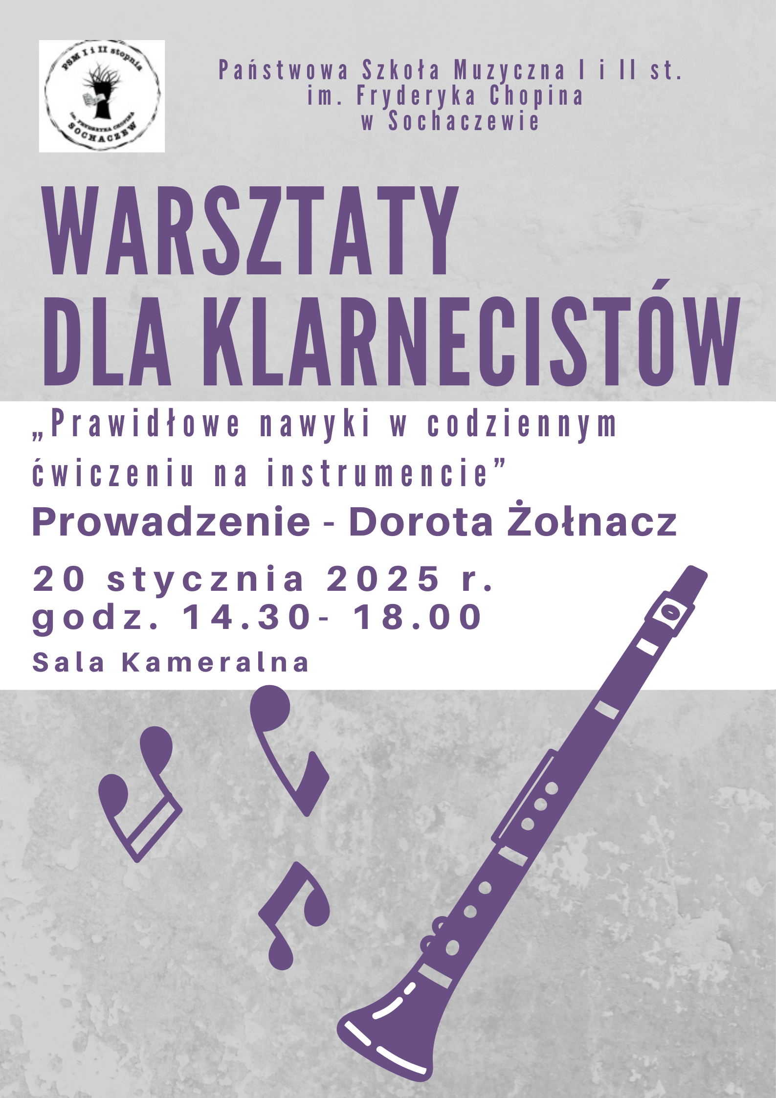 20 stycznia 2025 r. w godz. od 14.30 do 18.00 odbędą się warsztaty metodyczne dla nauczycieli i uczniów klas klarnetu Państwowej Szkoły Muzycznej I i II stopnia im. Fryderyka Chopina w Sochaczewie. Warsztaty o tematyce: "Prawidłowe nawyki w codziennym ćwiczeniu na instrumencie" poprowadzi Dorota Żołnacz.