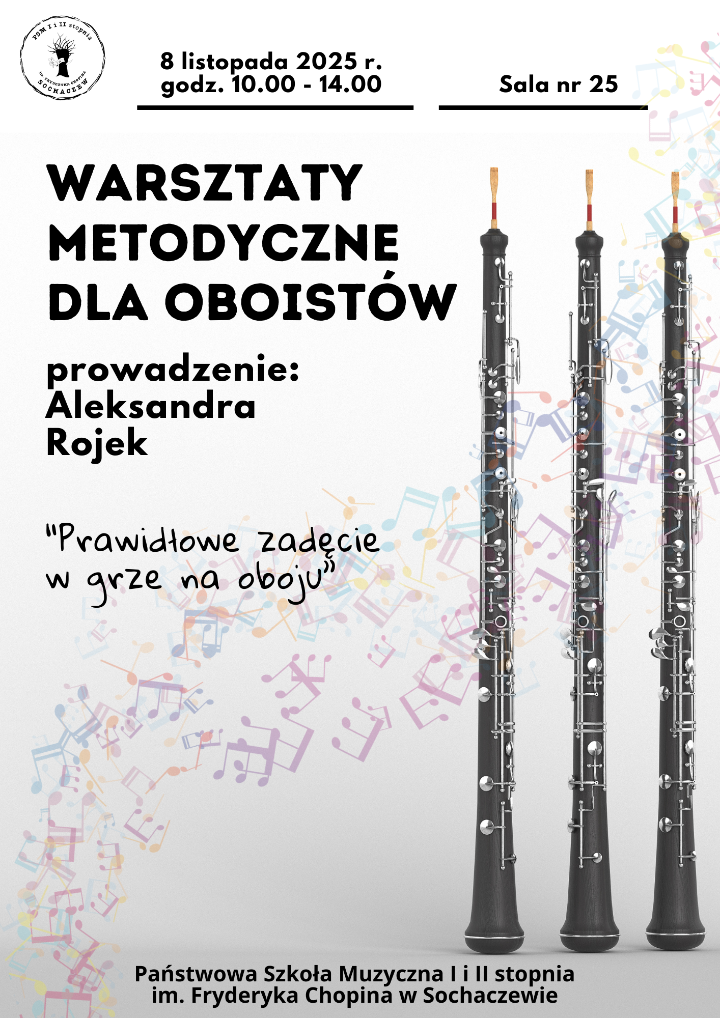 Nauczycieli i uczniów zapraszamy na warsztaty dla oboistów, które odbędą się w Państwowej Szkole Muzycznej I i II stopnia im. Fryderyka Chopina w Sochaczewie w najbliższą sobotę 8 listopada 2025 r. w godzinach od 10.00 do 14.00 w sali nr 25. Warsztaty o tematyce "Prawidłowe zadęcie w grze na oboju" poprowadzi Pani Aleksandra Rojek.