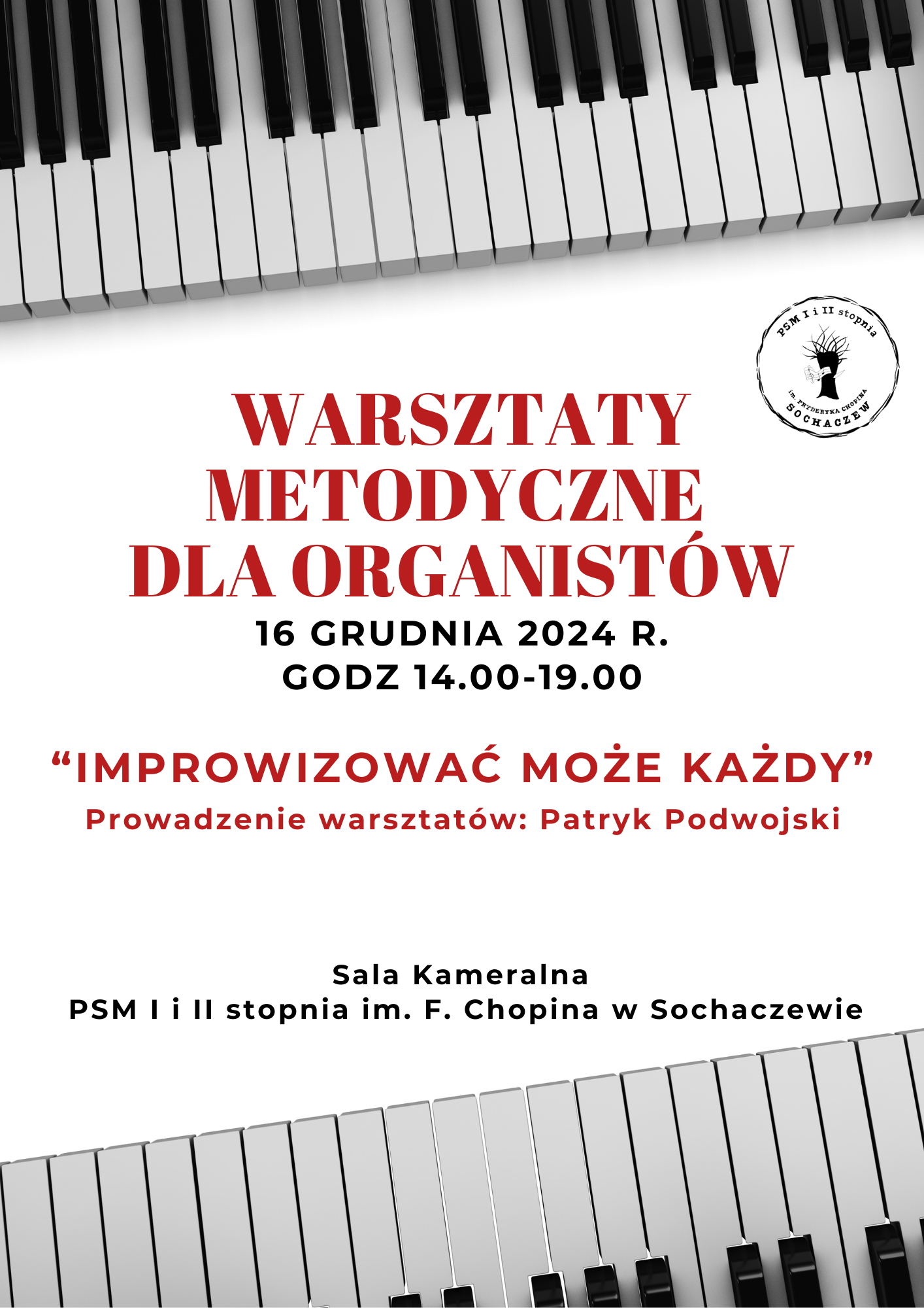 16 grudnia 2024 r. w godz. od 14.00 do 19.00 w Sali Koncertowej Państwowej Szkoły Muzycznej I i II stopnia im. Fryderyka Chopina w Sochaczewie odbędą się warsztaty metodyczne w formie lekcji otwartych dla organistów, które poprowadzi Patryk Podwojski. Temat warsztatów: "Improwizować może każdy".