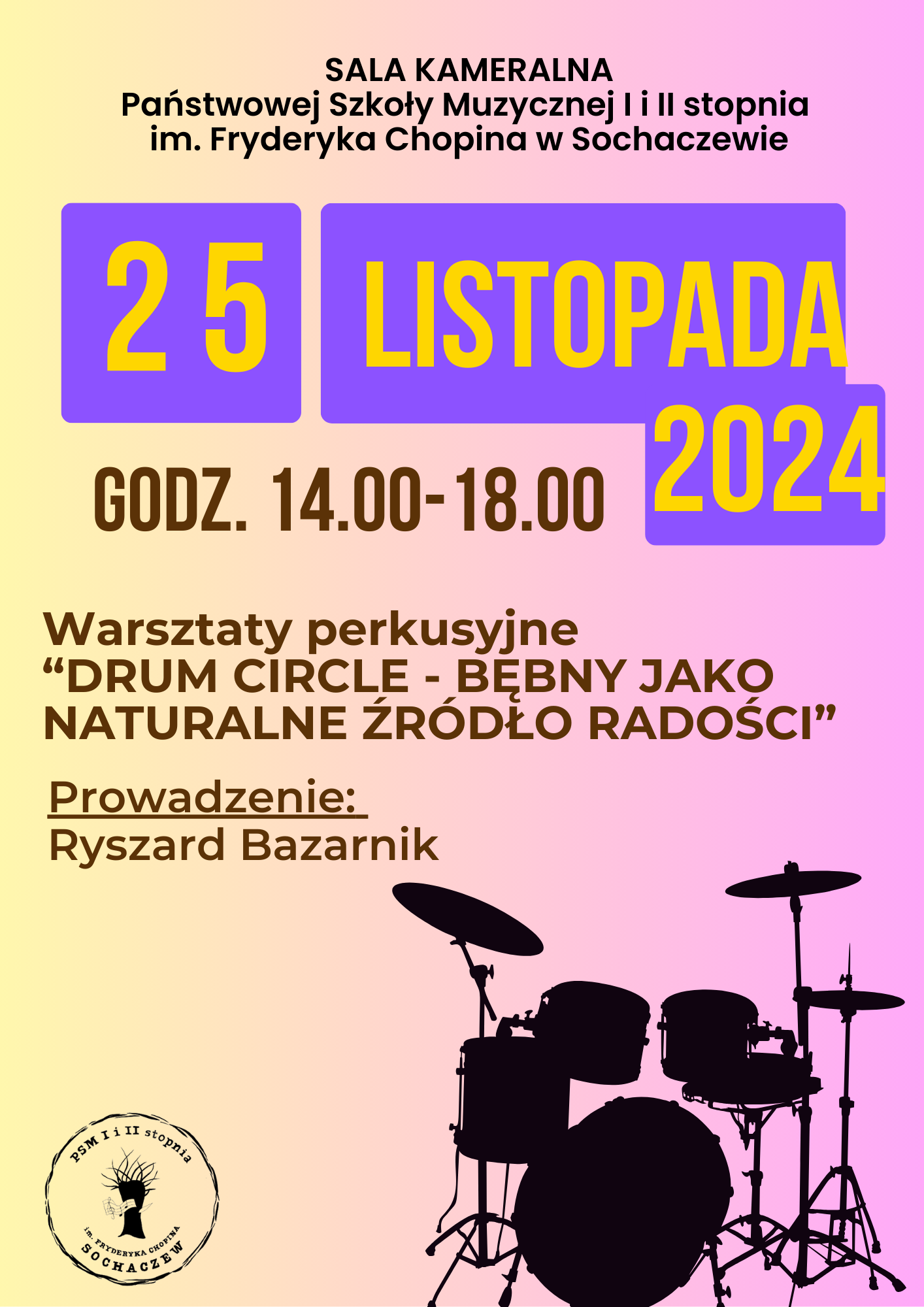 25 listopada 2024 r. w godz. od 14.00 do 18.00 odbędą się warsztaty metodyczne dla perkusistów, które poprowadzi p. Ryszard Bazarnik.
