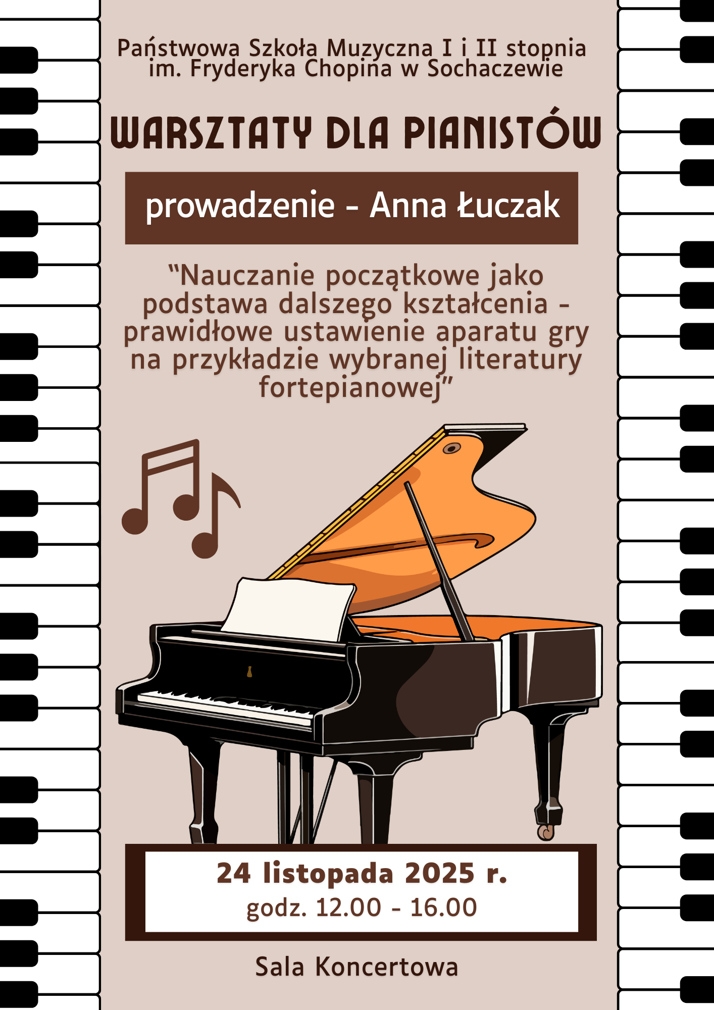 Warsztaty dla nauczycieli i uczniów klas fortepianu o tematyce “Nauczanie początkowe jako podstawa dalszego kształcenia - prawidłowe ustawienie aparatu gry na przykładzie wybranej literatury fortepianowej” poprowadzi Pani Anna Łuczak. Warsztaty odbędą się 24 listopada 2025 r. w Sali Koncertowej Państwowej Szkoły Muzycznej I i II stopnia im. Fryderyka Chopina w Sochaczewie w godz. od. 12.00 do 16.00.