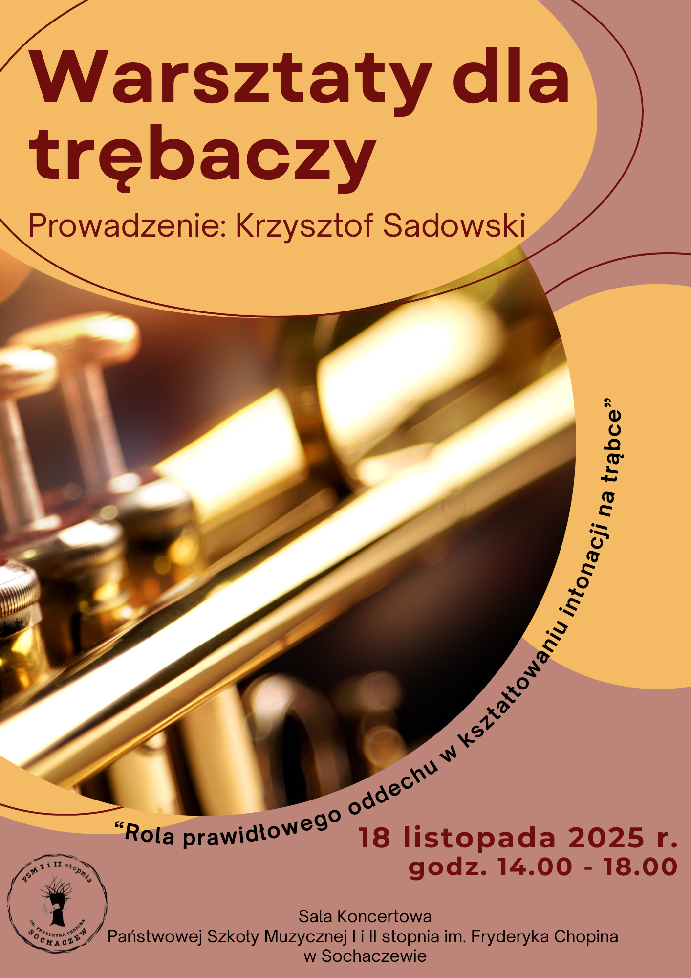 Zapraszamy na warsztaty metodyczne dla trębaczy, nauczycieli i uczniów Państwowej Szkoły Muzycznej I i II stopnia im. Fryderyka Chopina w Sochaczewie, które odbędą się 18 listopada 2025 r. w godz. od 14.00 do 18.00. Warsztaty o tematyce: "Rola prawidłowego oddechu w kształtowaniu intonacji na trąbce" poprowadzi p. Krzysztof Sadowski.