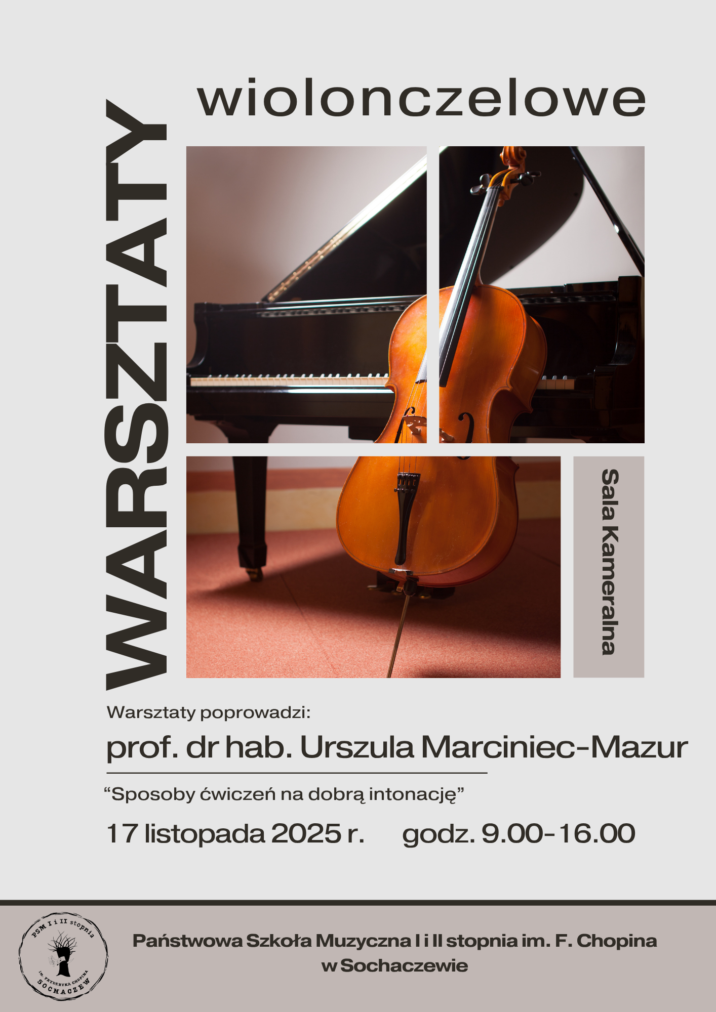 Warsztaty dla nauczycieli i uczniów klas wiolonczeli naszej szkoły odbędą się w Państwowej Szkole Muzycznej I i II stopnia im. Fryderyka Chopina w Sochaczewie 17 listopada 2025 r. w godzinach od 9.00 do 16.00. Warsztaty o tematyce "Sposoby ćwiczeń na dobrą intonację" poprowadzi prof. dr hab. Urszula Marciniec-Mazur.