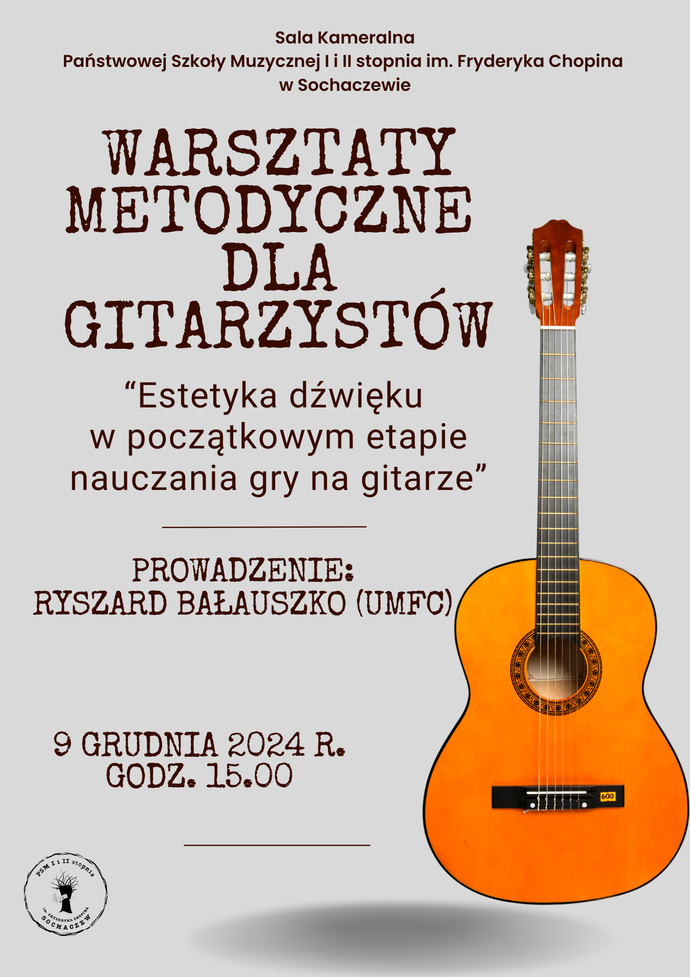 9 grudnia 2024 r. od godz. 15.00 w Sali Kameralnej Państwowej Szkoły Muzycznej I i II stopnia im. Fryderyka Chopina w Sochaczewie rozpoczną sie warsztaty metodyczne dla gitarzystów. Tematem spotkania będzie “Estetyka dźwięku w początkowym etapie nauczania gry na gitarze”. Warsztaty w formie lekcji otwartych poprowadzi Ryszard Bałauszko (UMFC).