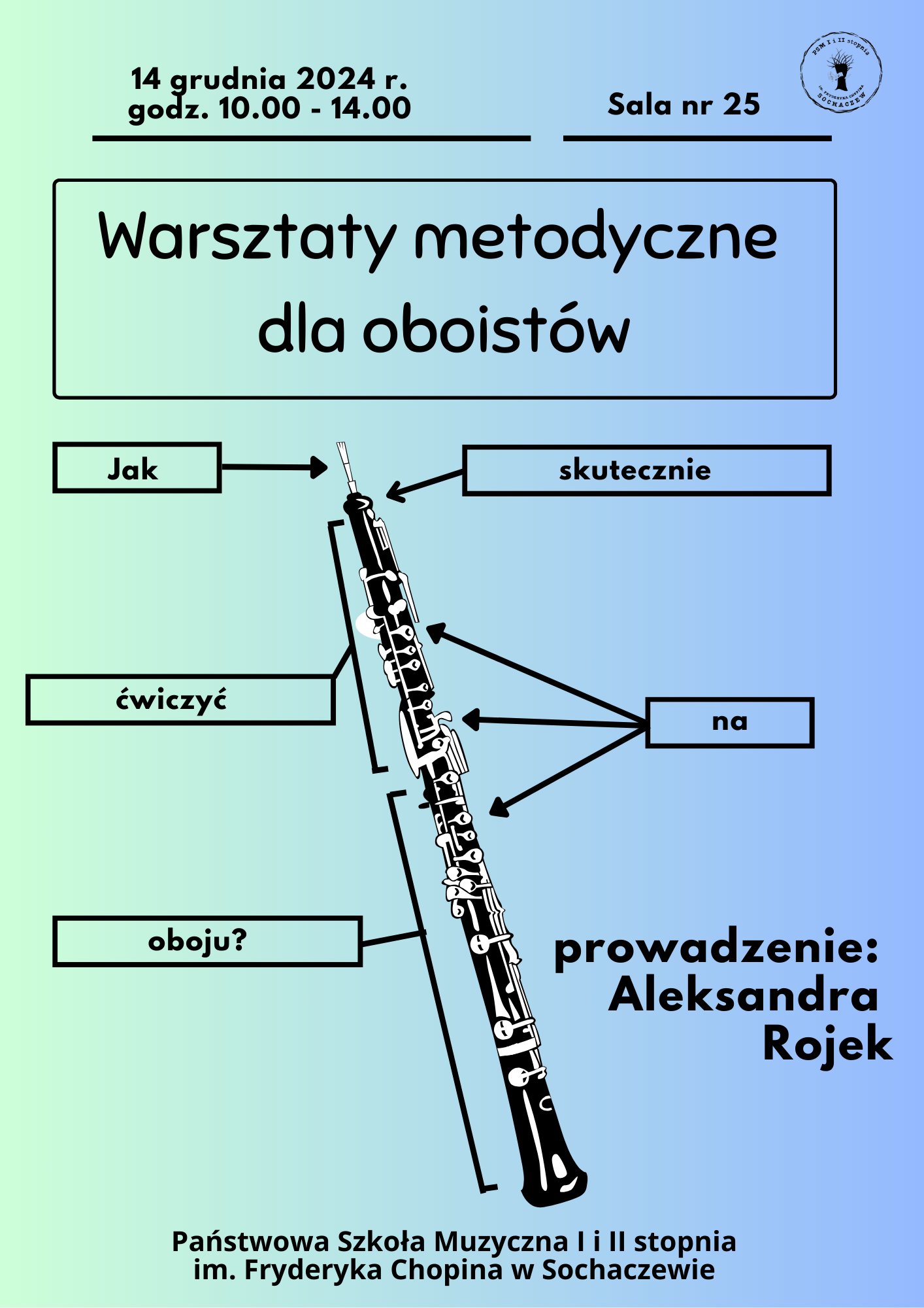 Zapraszamy na warsztaty metodyczne dla oboistów, które poprowadzi Aleksandra Rojek. Warsztaty o tematyce: "Jak skutecznie ćwiczyć na oboju" odbędą się 14 grudnia 2024 r. w sali nr 25.