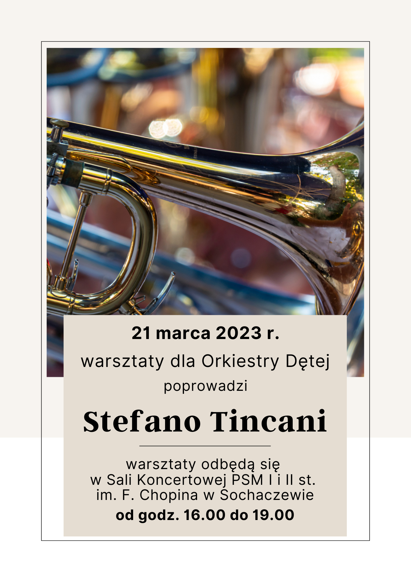 Warsztaty poprowadzi puzonista Stefano Tincani. Studia ukończył w roku 2002 w Konserwatorium Muzycznym “L. Campiani” w Mantui pod kierunkiem M° Cristiano Boschesi. W 2011 roku otrzymał tytuł magistra na wydziale kompozycji i interpretacji muzycznej w Wyższej Szkole Muzycznej “A. Peri” w Reggio Emilia pod kierunkiem M° Gianluca Scipioni. Brał udział w licznych kursach mistrzowskich pod okiem muzyków o międzynarodowej sławie takich, jak między innymi: Josepha Alessi, Stevena Mead, Bruna Flau, Marca Pierobon.