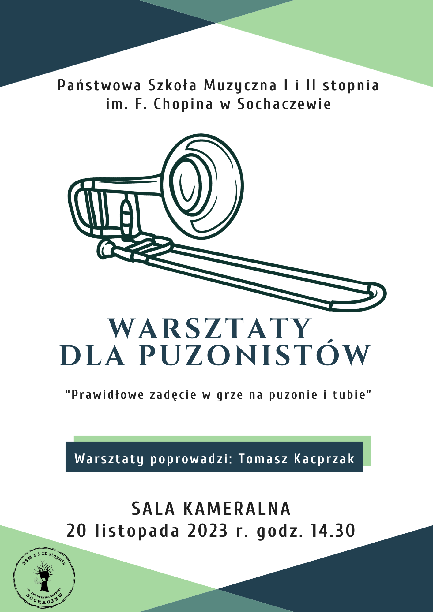 20 listopada 2023 r. o godz. 14.30 rozpoczną się warsztaty dla puzonistów, które poprowadzi Tomasz Kacprzak. Głównym tematem tego spotkania metodycznego będzie "Prawidłowe zadęcie w grze na puzonie i tubie".