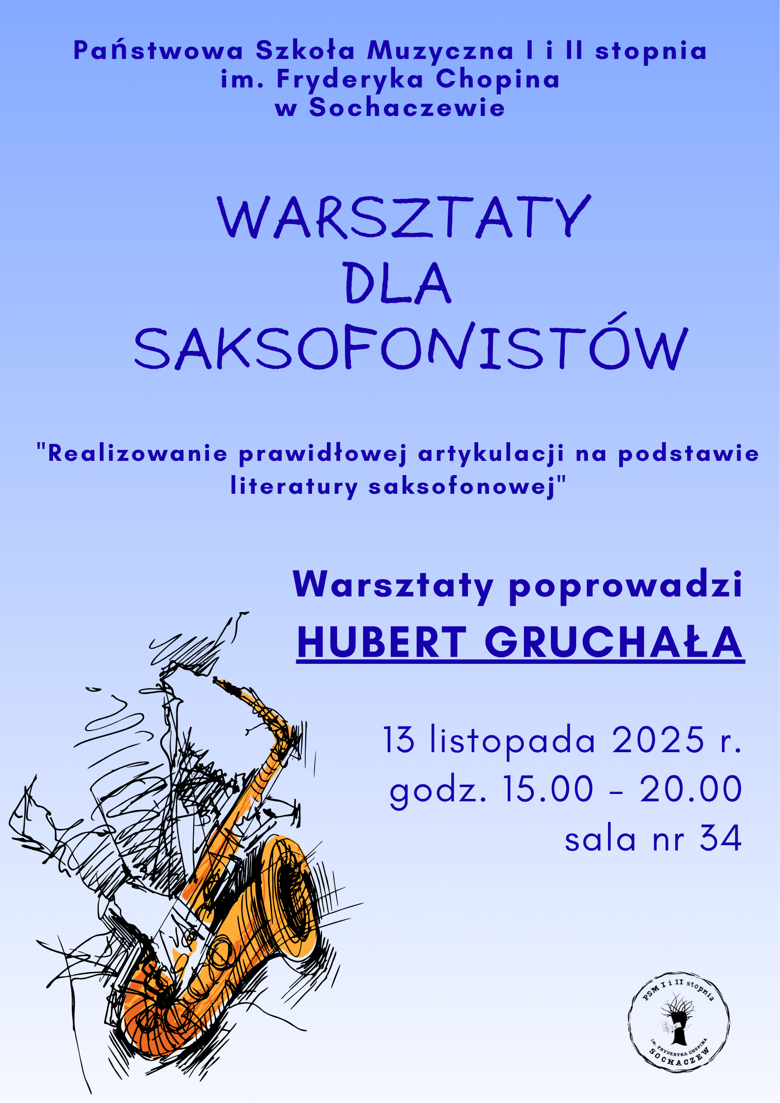 Nauczycieli i uczniów zapraszamy na warsztaty dla saksofonistów, które odbędą się w Państwowej Szkole Muzycznej I i II stopnia im. Fryderyka Chopina w Sochaczewie 13 listopada 2025 r. w godzinach od 15.00 do 20.00 w sali nr 34. Warsztaty o tematyce "Realizowanie prawidłowej artykulacji na podstawie literatury saksofonowej" poprowadzi Pan Hubert Gruchała