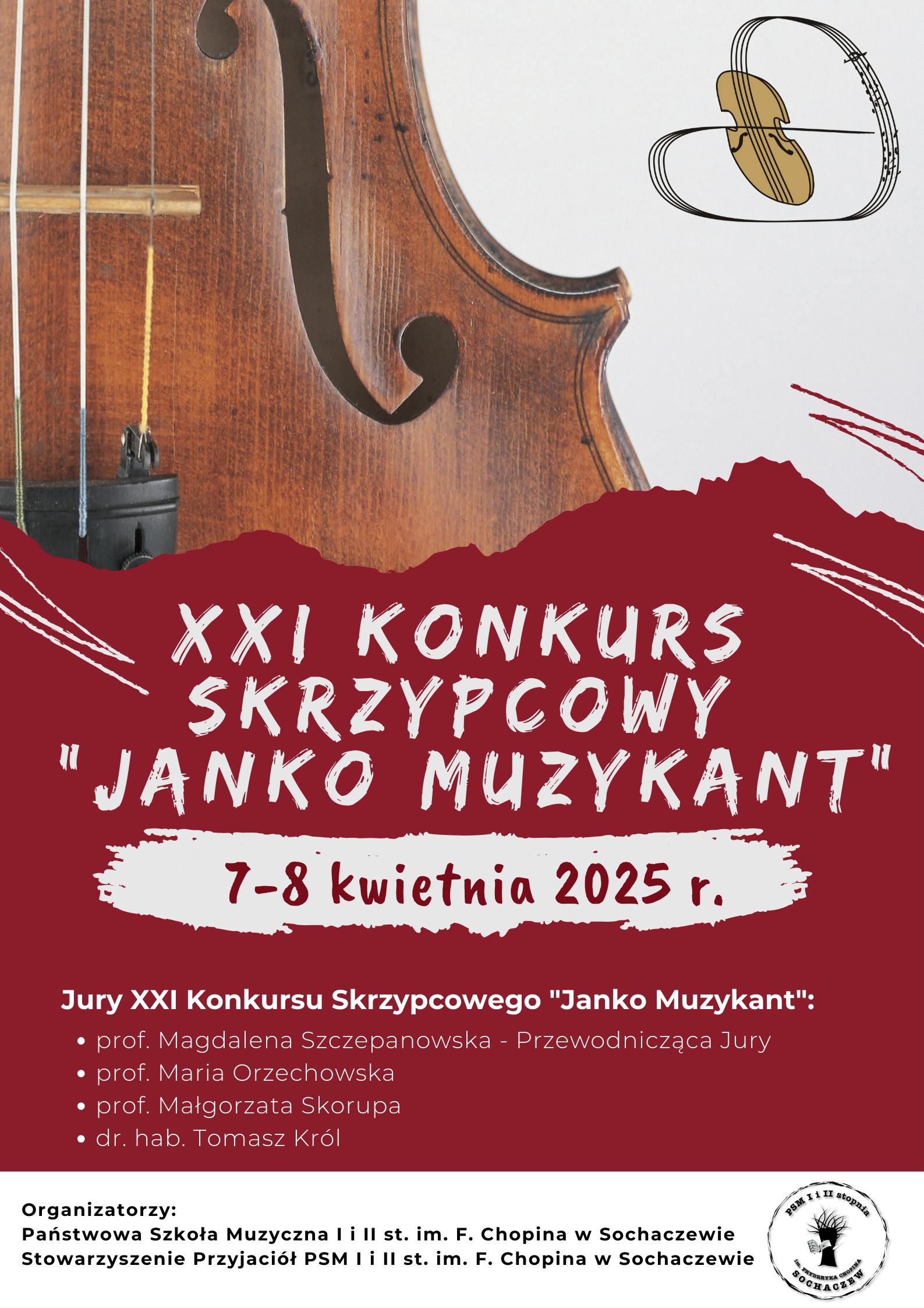 XXI Konkurs Skrzypcowy "Janko Muzykant" odbędzie się w dniach 7-8 kwietnia 2025 r. w Państwowej Szkole Muzycznej I i II stopnia im. Fryderyka Chopina w Sochaczewie.