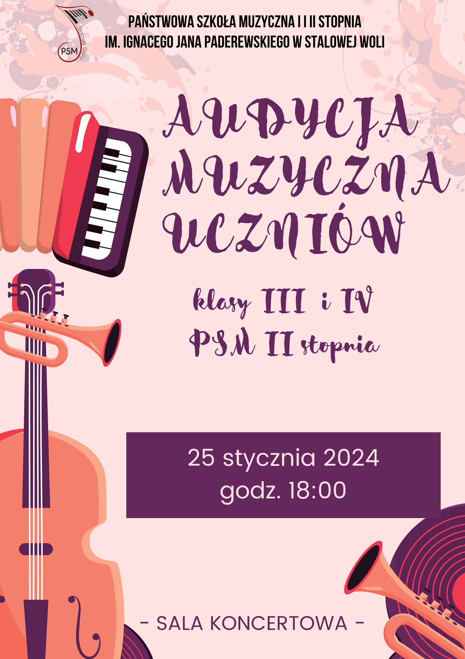 Audycja muzyczna uczniów klasy III i IV PSM II stopnia 25 stycznia 2024 22.01.2024 Serdecznie zapraszamy Zdjęcia (1) Pokaż zdjęcie 1 z galerii.