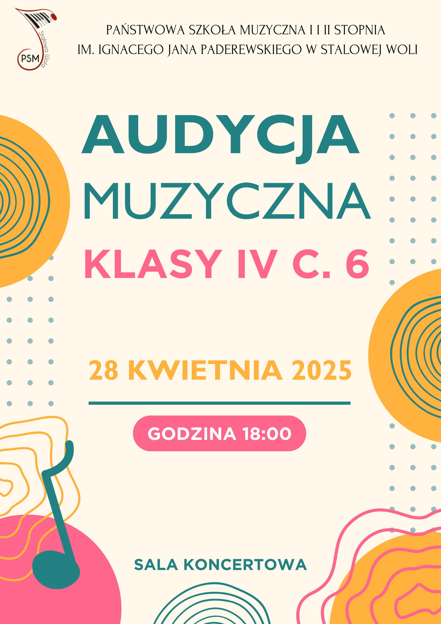 Serdecznie zapraszamy na audycję muzyczną uczniów klasy IV c.6 Państwowej Szkoły Muzycznej I i II stopnia im. Ignacego Jana Paderewskiego w Stalowej Woli.