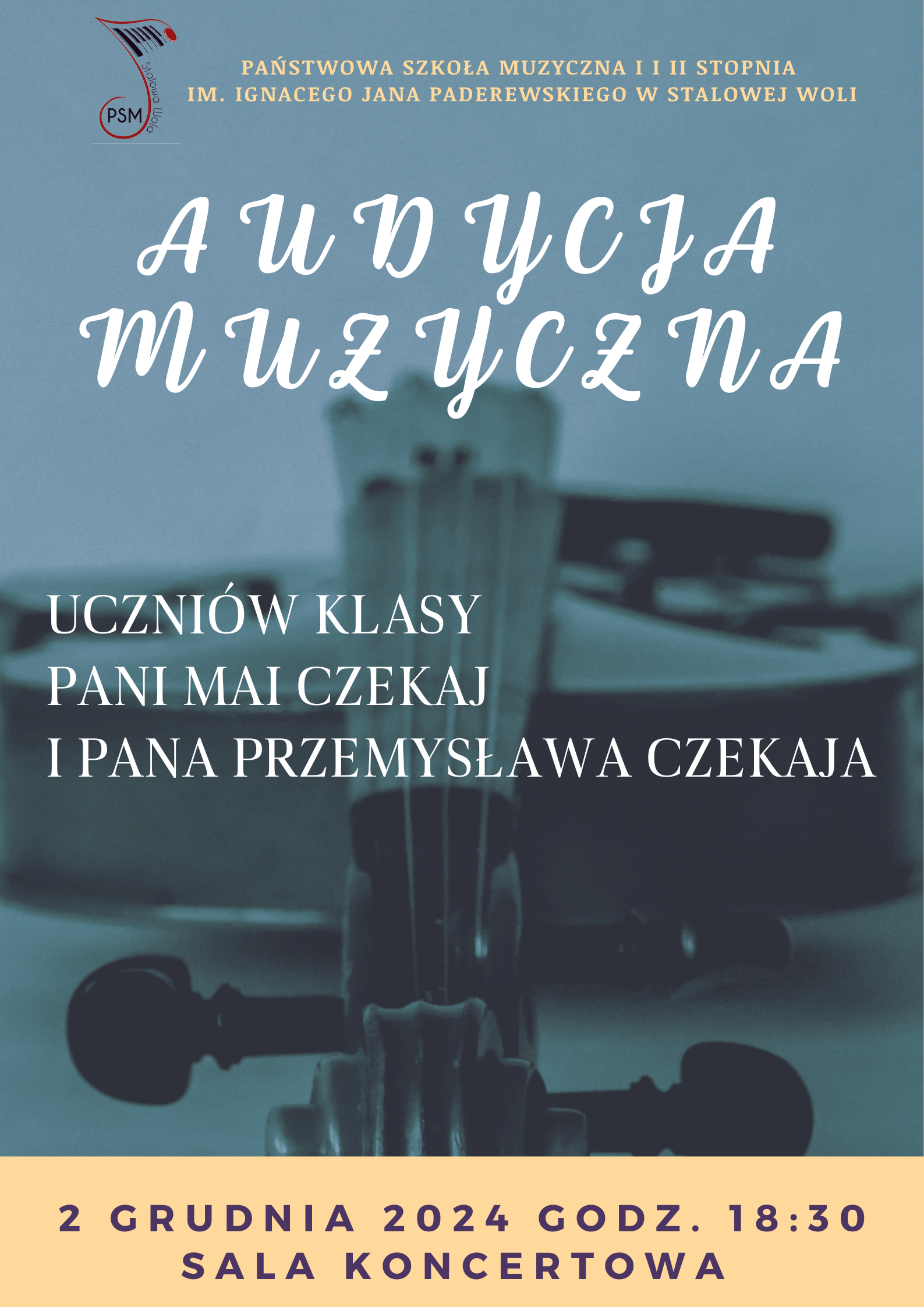 Audycja muzyczna Uczniów Pani Mai Czekaj i Pana Przemysława Czekaja 2 grudnia 2024 28.11.2024 Serdecznie zapraszamy na Audycję muzyczną. Wstęp wolny Zdjęcia (1) Pokaż zdjęcie 1 z galerii.