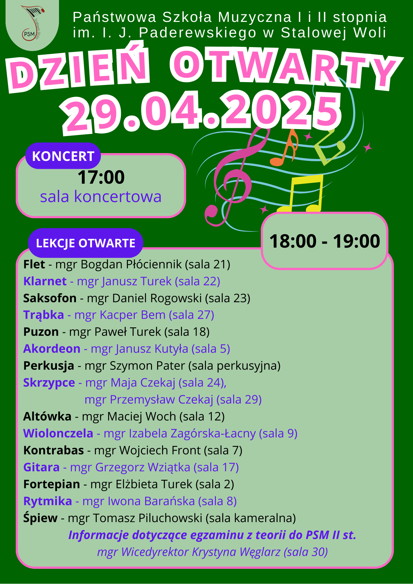 – Informacje dotyczące egzaminu z teorii do PSM II stopnia udziela mgr Wicedyrektor Krystyna Węglarz (sala 30)