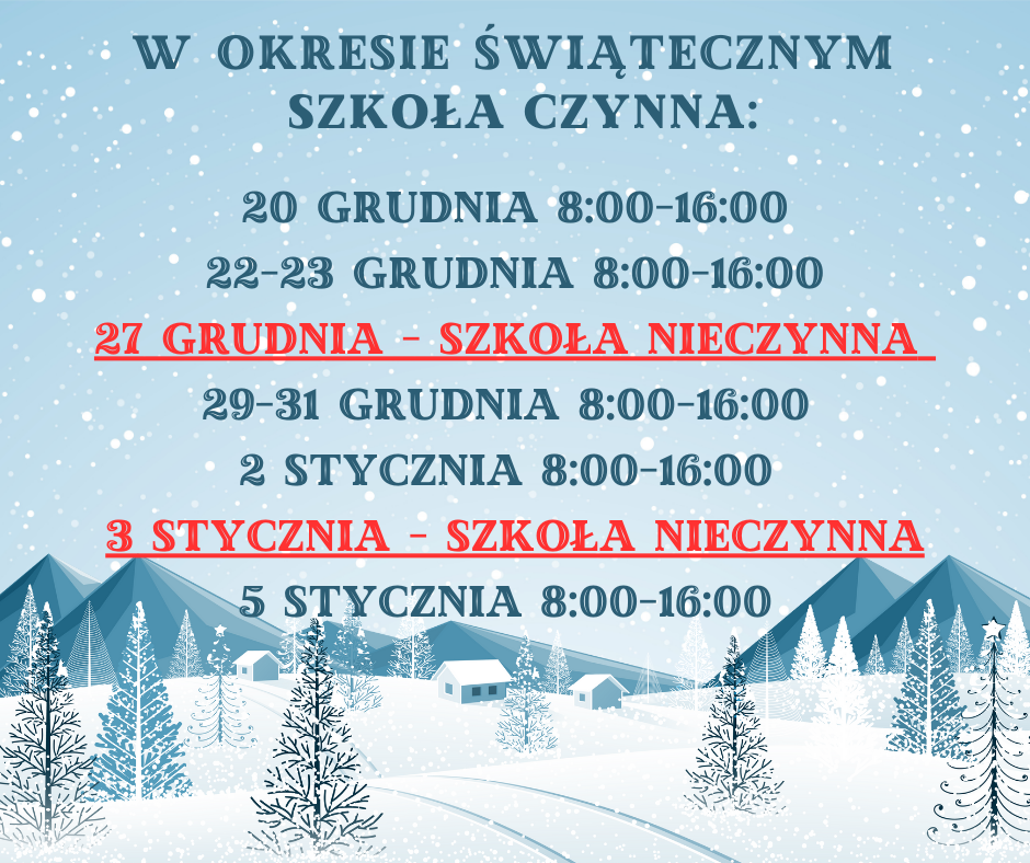 Informujemy, że w okresie świątecznym szkoła będzie funkcjonować według następującego harmonogramu: