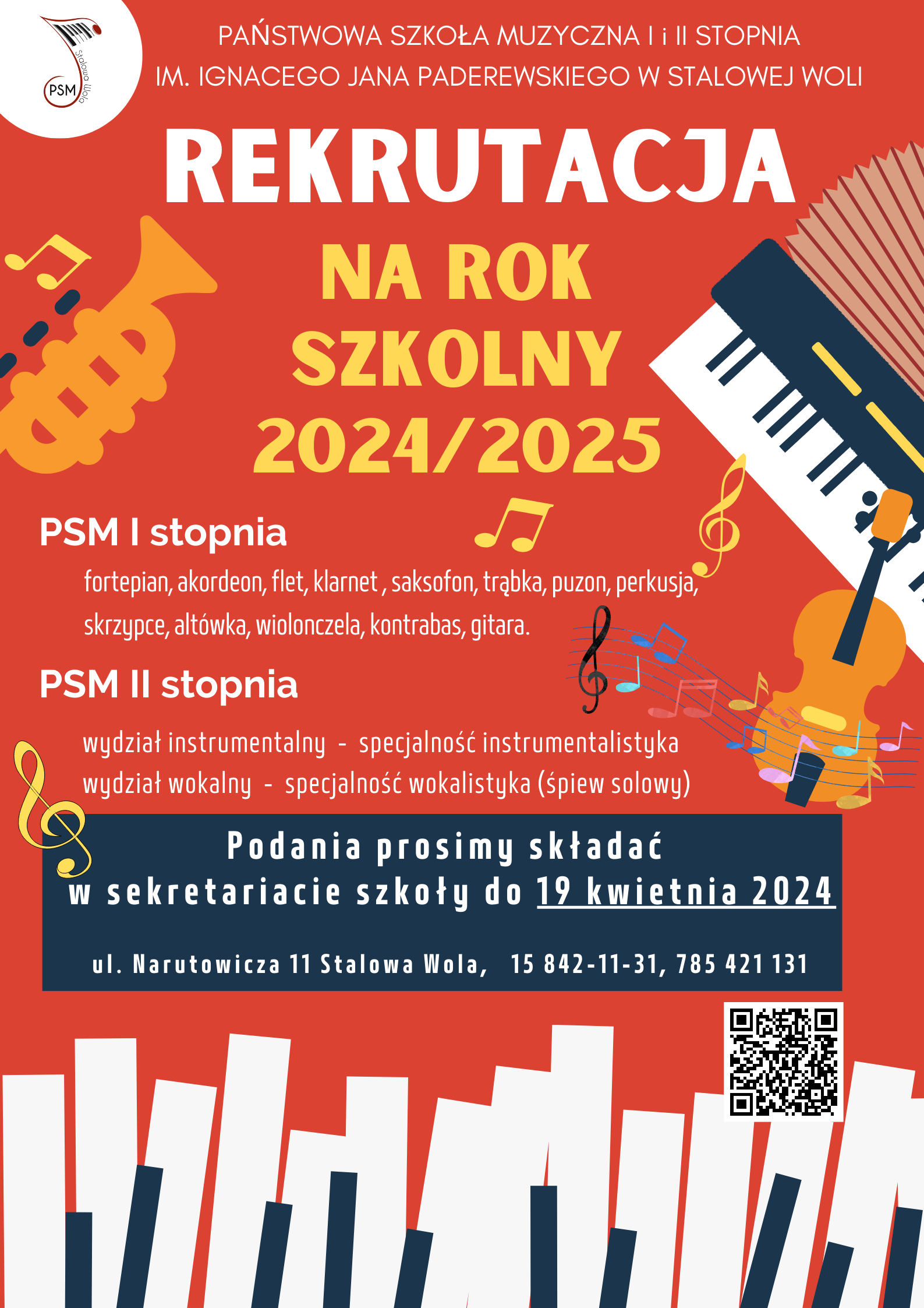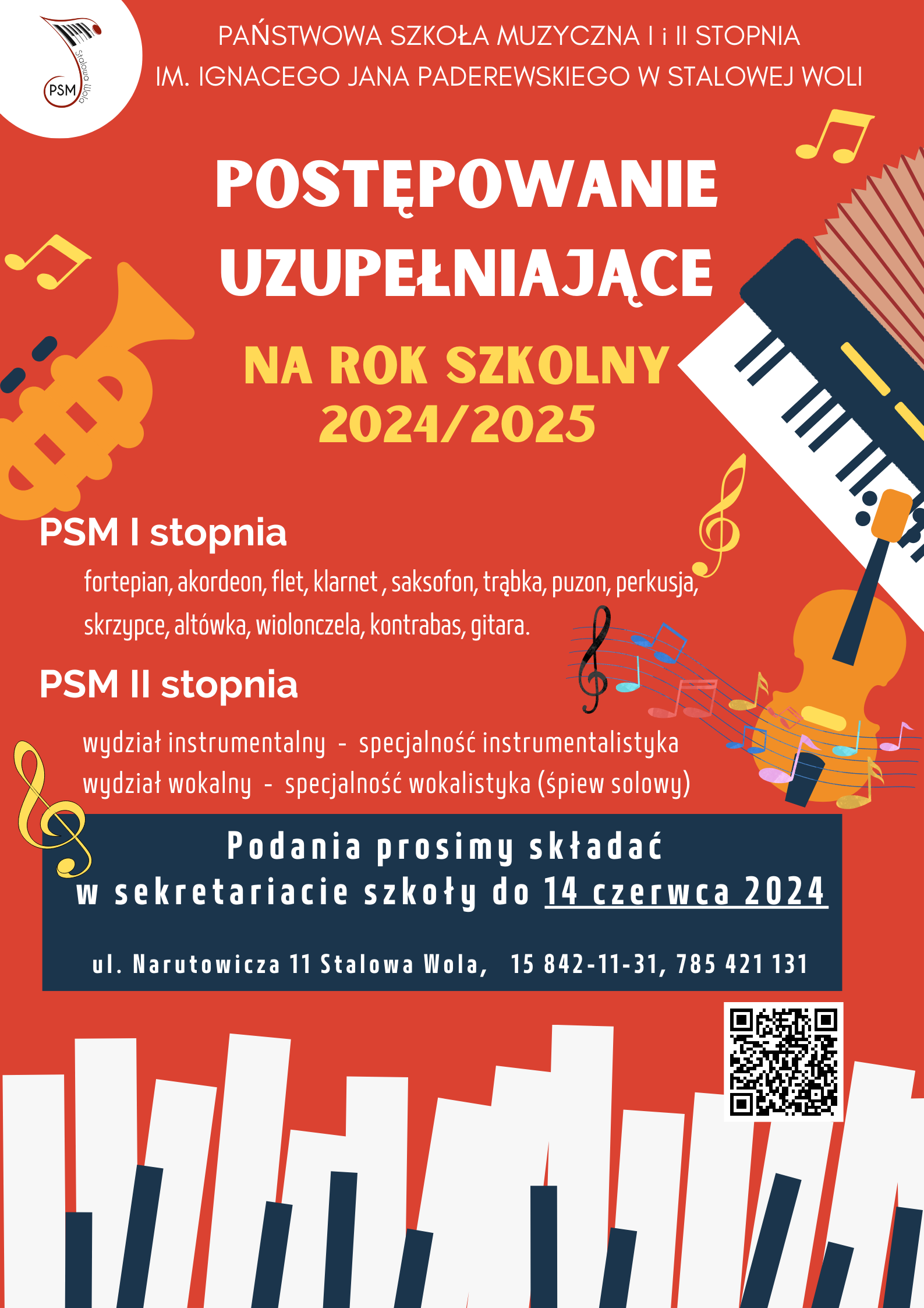 Dyrekcja Państwowej Szkoły Muzycznej I i II stopnia im. Ignacego Jana Paderewskiego w Stalowej Woli informuje, że 29 kwietnia 2024r. na tablicy szkolnej zostały udostępnione listy osób zakwalifikowanych i niezakwalifikowanych do nauki w PSM I i II stopnia w Stalowej Woli