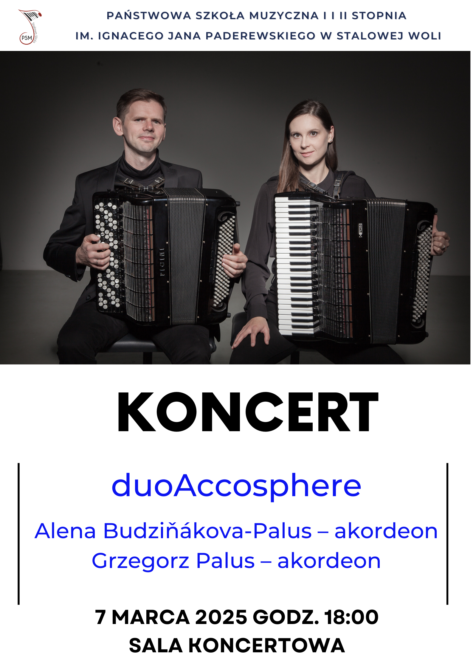 Serdecznie zapraszamy na wyjątkowy koncert duetu akordeonowego duoAccosphere, który odbędzie się 7 marca 2025 roku o godzinie 18:00 w sali koncertowej naszej szkoły.