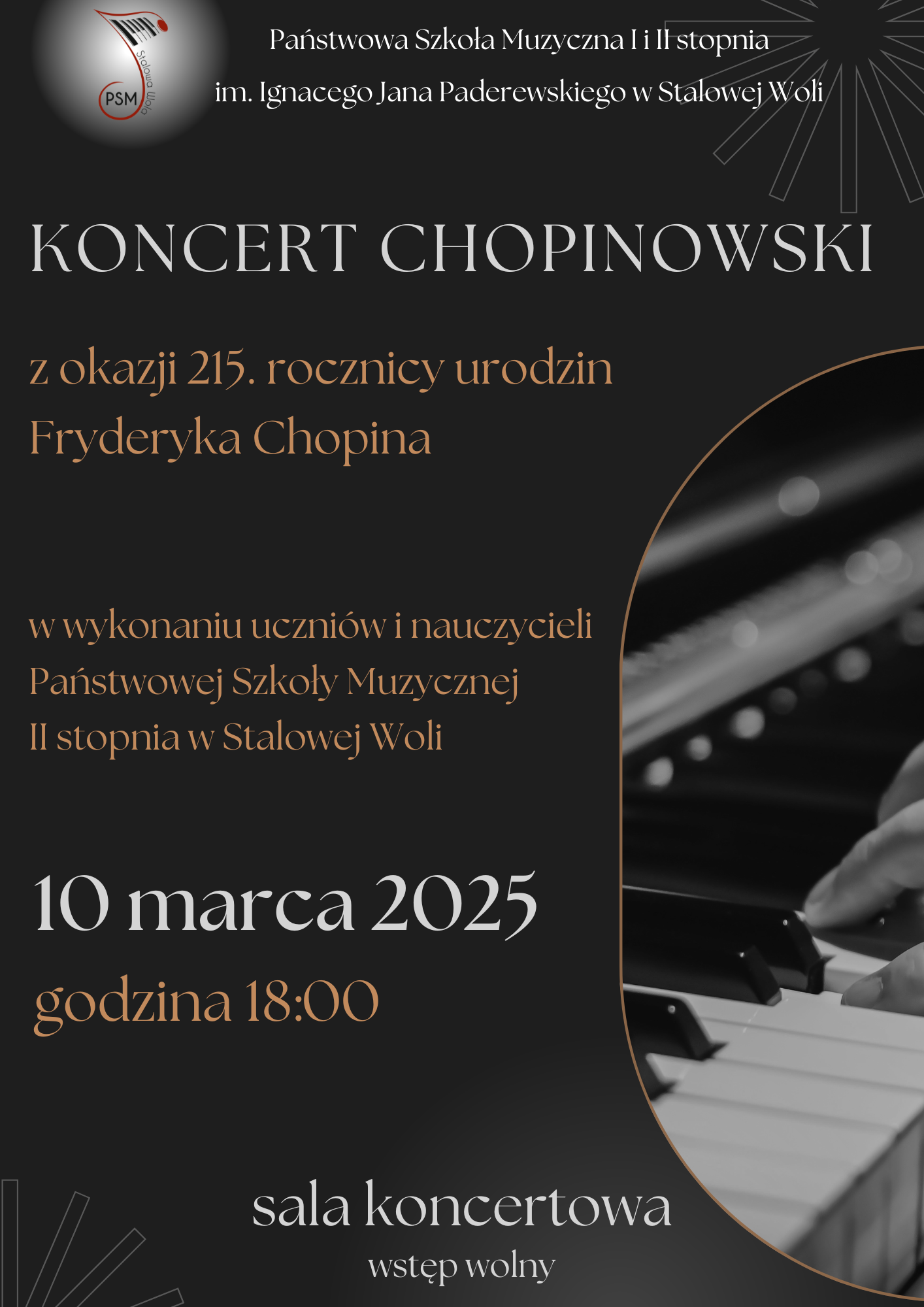 Państwowa Szkoła Muzyczna I i II stopnia im. Ignacego Jana Paderewskiego w Stalowej Woli serdecznie zaprasza na wyjątkowy Koncert Chopinowski, który odbędzie się 10 marca 2025 roku o godzinie 18:00 w sali koncertowej szkoły.