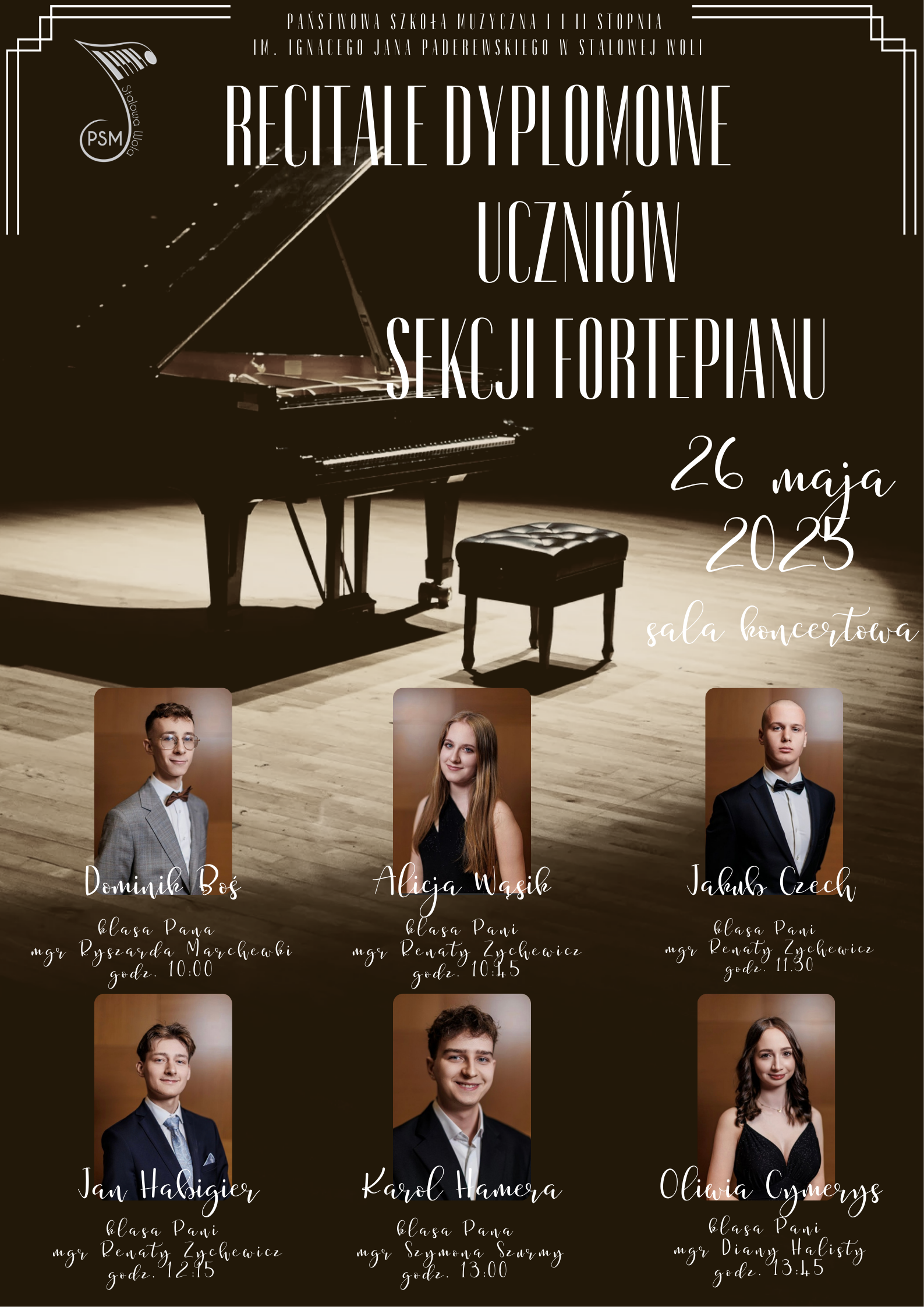 W dniu 26 maja 2025 roku w sali koncertowej Państwowej Szkoły Muzycznej I i II stopnia im. Ignacego Jana Paderewskiego w Stalowej Woli odbędą się recitale dyplomowe uczniów sekcji fortepianu.