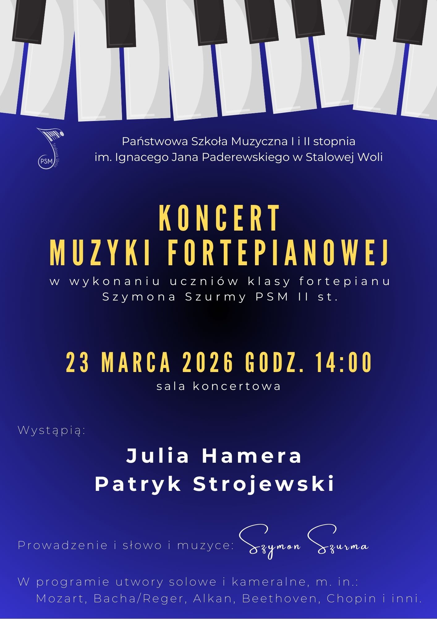 Koncert muzyki fortepianowej w wykonaniu uczniów klasy fortepianu Szymona Szurmy PSM II st. 23 marca 2026