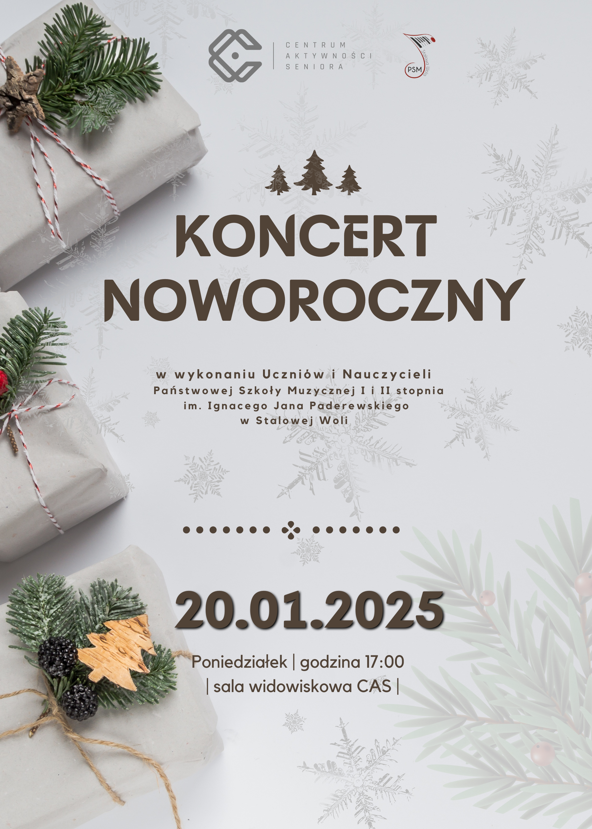 Zapraszamy serdecznie na Koncert Noworoczny, który odbędzie się 20 stycznia 2025 roku o godzinie 17:00 w sali widowiskowej Centrum Aktywności Seniora.