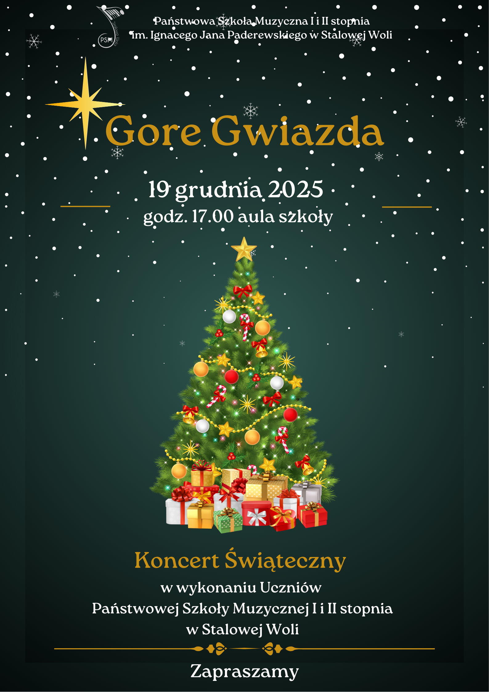 Państwowa Szkoła Muzyczna I i II stopnia w Stalowej Woli serdecznie zaprasza na Koncert Świąteczny „Gore Gwiazda”, który odbędzie się 19 grudnia o godz. 17:00.