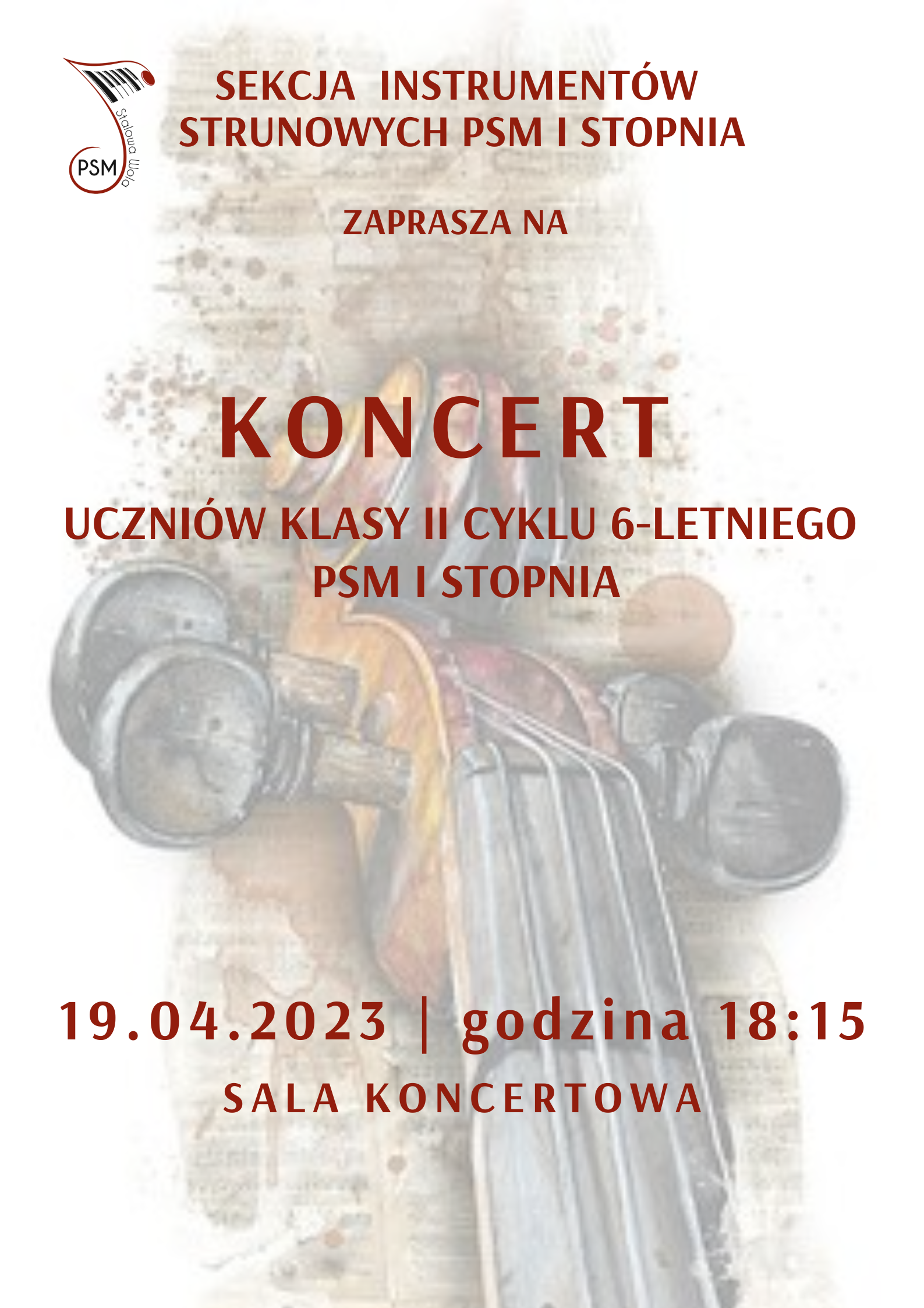 19 kwietnia 2023 o godzinie 18:15 zapraszamy na koncert w wykonaniu uczniów klasy II cyklu 6-letniego PSM I stopnia.