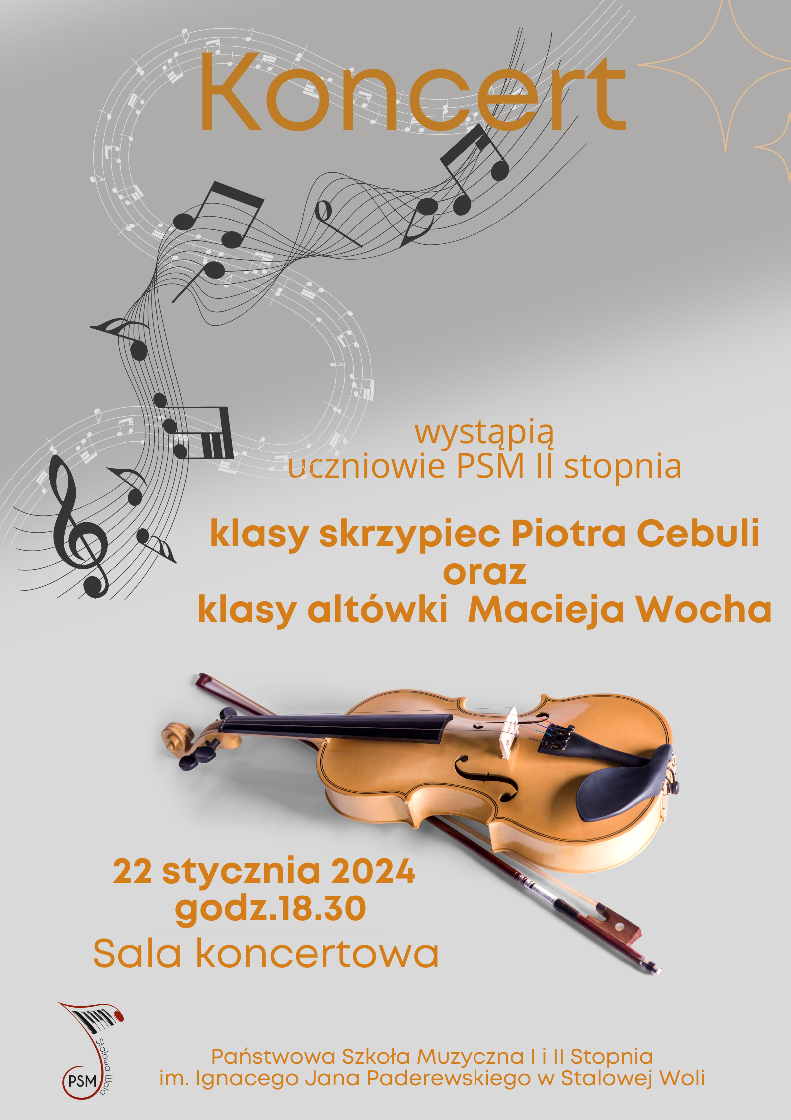 Koncert Uczniów klasy skrzypiec i altówki 22 stycznia 2024 19.01.2024 Serdecznie zapraszamy Zdjęcia (1) Pokaż zdjęcie 1 z galerii.