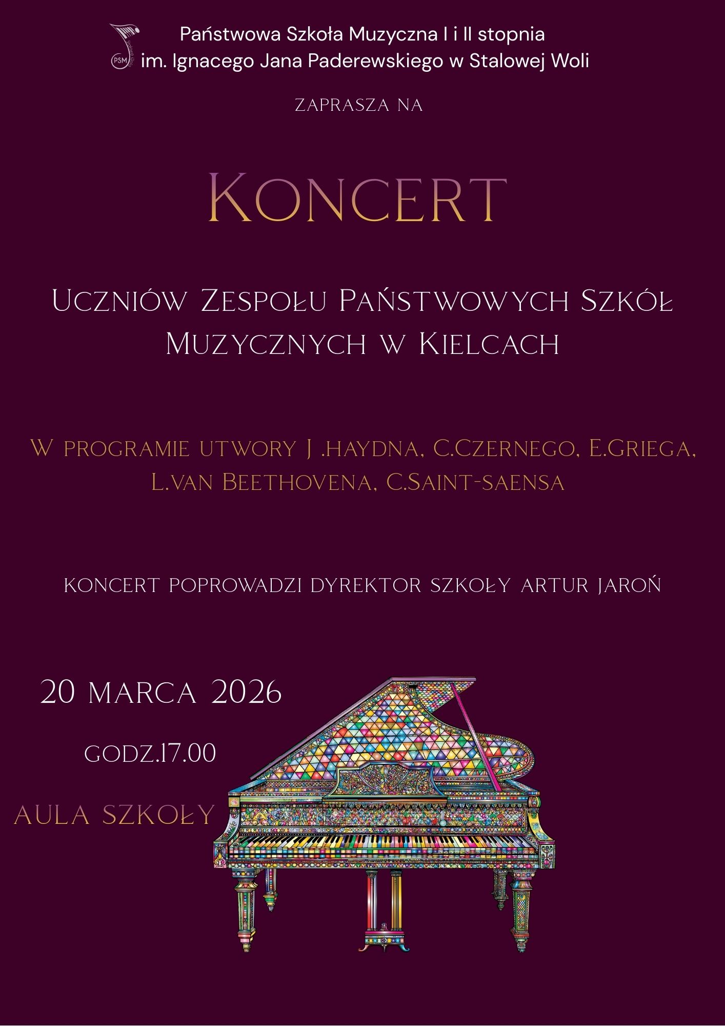 Państwowa Szkoła Muzyczna I i II stopnia im. Ignacego Jana Paderewskiego w Stalowej Woli serdecznie zaprasza na koncert uczniów Zespołu Państwowych Szkół Muzycznych w Kielcach.