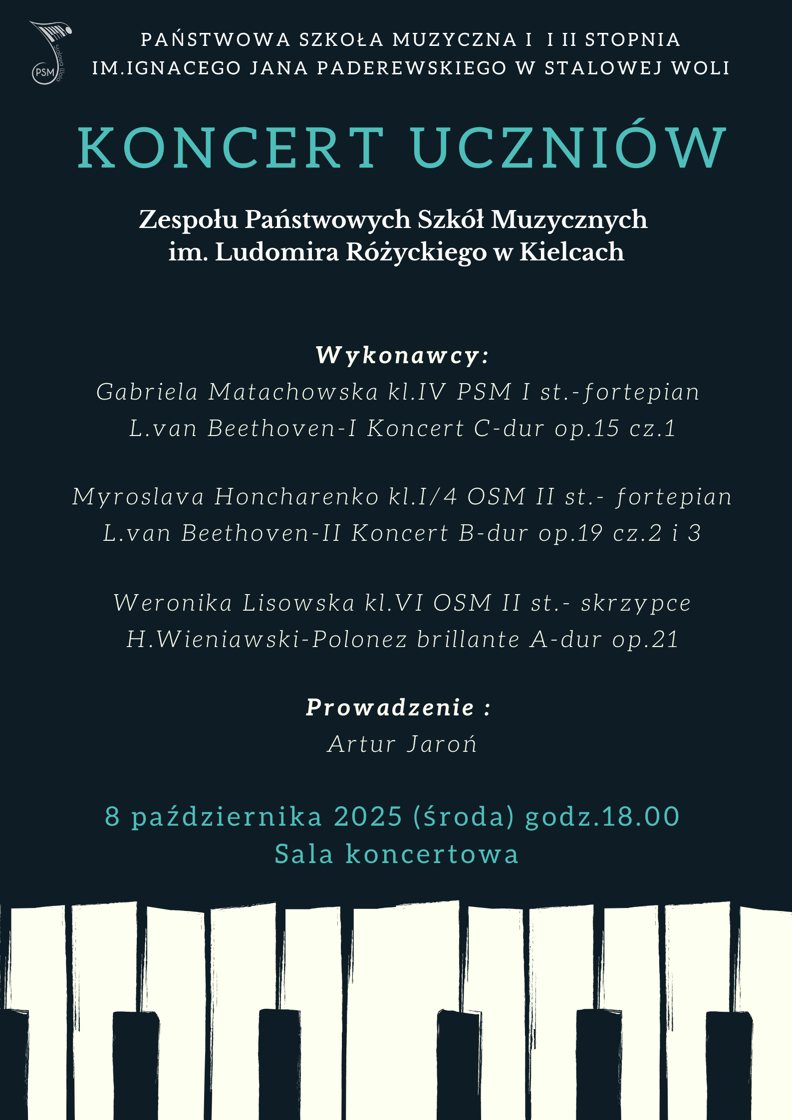 Już w najbliższą środę tj. 8 października 2025r. o godzinie 18:00 będziemy gościć u nas w szkole Uczniów oraz Nauczycieli Zespołu Państwowych Szkół Muzycznych im. Ludomira Różyckiego w Kielcach