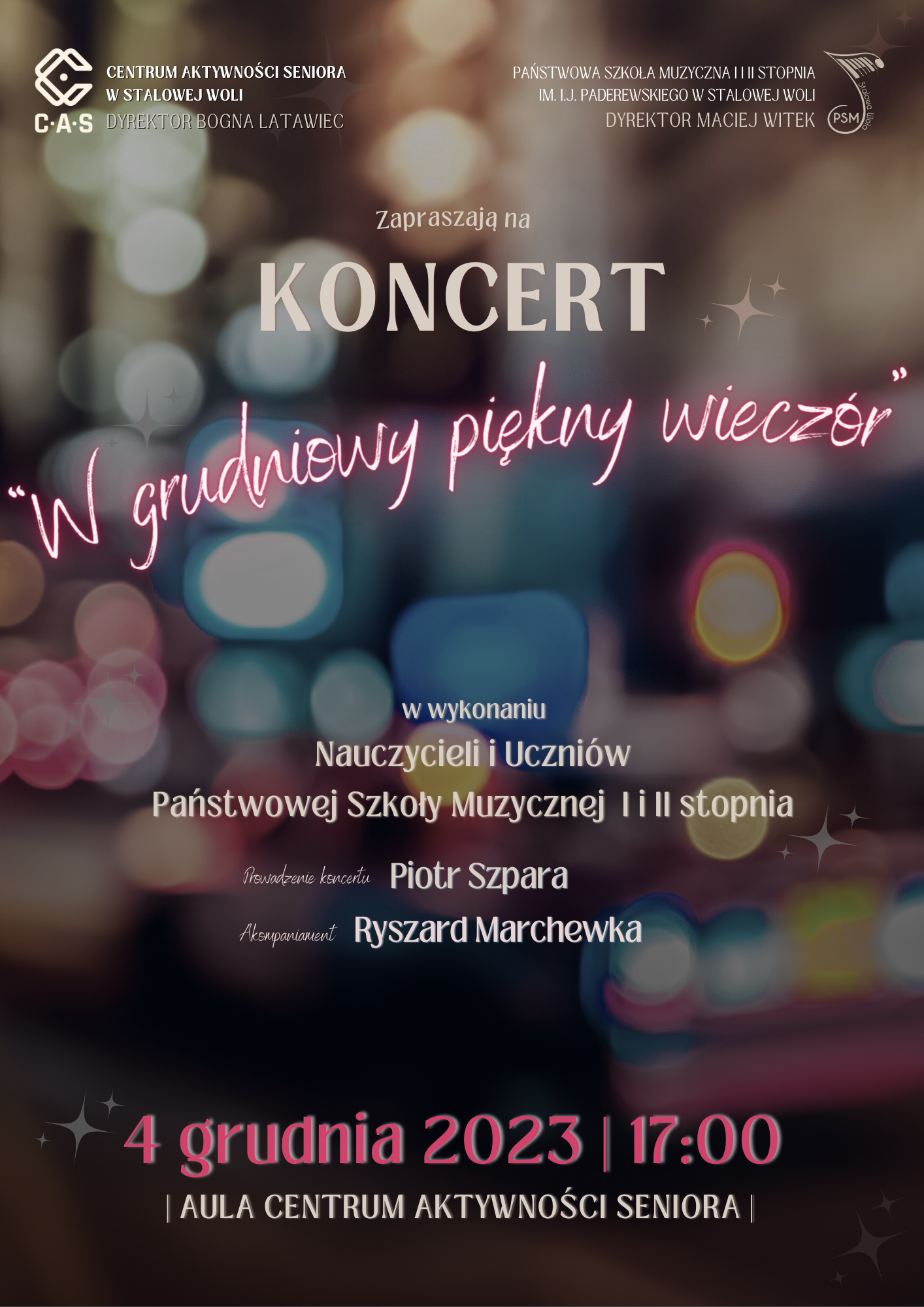 Serdecznie zapraszamy na Koncert "W grudniowy piękny wieczór" - 4 grudnia 2023r. godz. 17:00 w Centrum Aktywności Seniora w Stalowej Woli