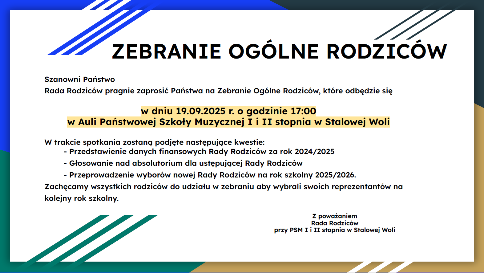 Rada Rodziców Państwowej Szkoły Muzycznej I i II stopnia im. Ignacego Jana Paderewskiego w Stalowej Woli zaprasza Rodziców i Opiekunów na Ogólne zebranie rodziców - 19 września 2025 godz. 17:00 sala koncertowa