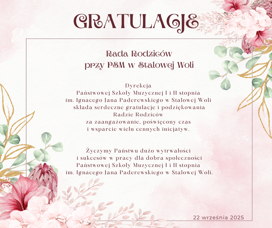 Dyrekcja Państwowej Szkoły Muzycznej I i II stopnia im. Ignacego Jana Paderewskiego w Stalowej Woli składa serdeczne gratulacje i podziękowania Radzie Rodziców za zaangażowanie, poświęcony czas i wsparcie wielu cennych inicjatyw.