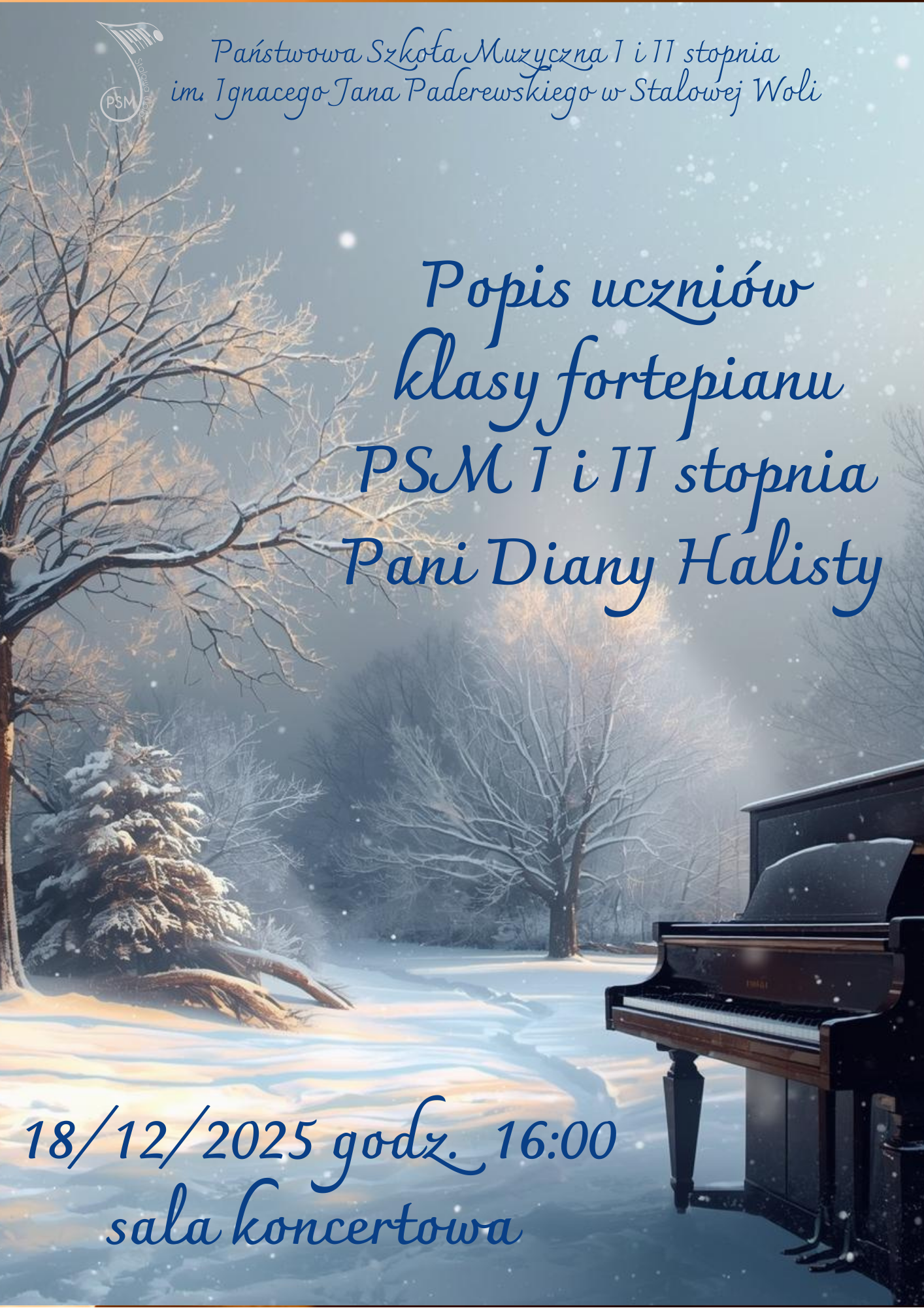 Państwowa Szkoła Muzyczna I i II stopnia im. Ignacego Jana Paderewskiego w Stalowej Woli serdecznie zaprasza na popis uczniów klasy fortepianu PSM I i II stopnia Pani Diany Halisty.