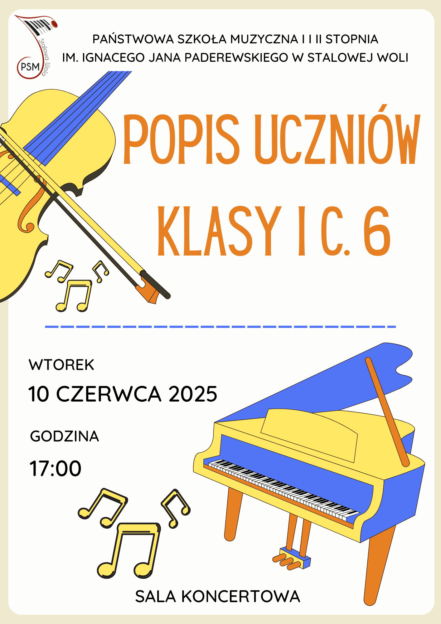 Serdecznie zapraszamy na popis uczniów klasy I c. 6 Państwowej Szkoły Muzycznej I i II stopnia im. Ignacego Jana Paderewskiego w Stalowej Woli.
