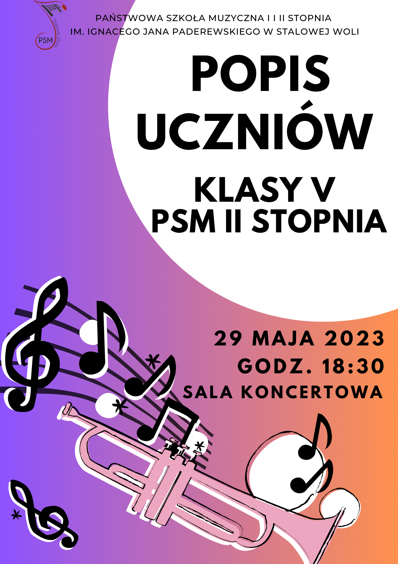 Serdecznie zapraszamy na Popis Uczniów klasy V PSM II stopnia - 29 maja 2023 godz. 18:30