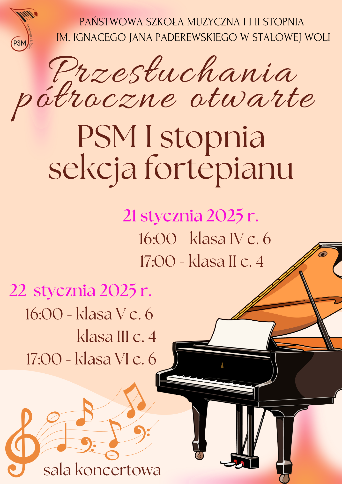 Przesłuchania półroczne otwarte PSM I stopnia - fortepian 21-22 stycznia 2025