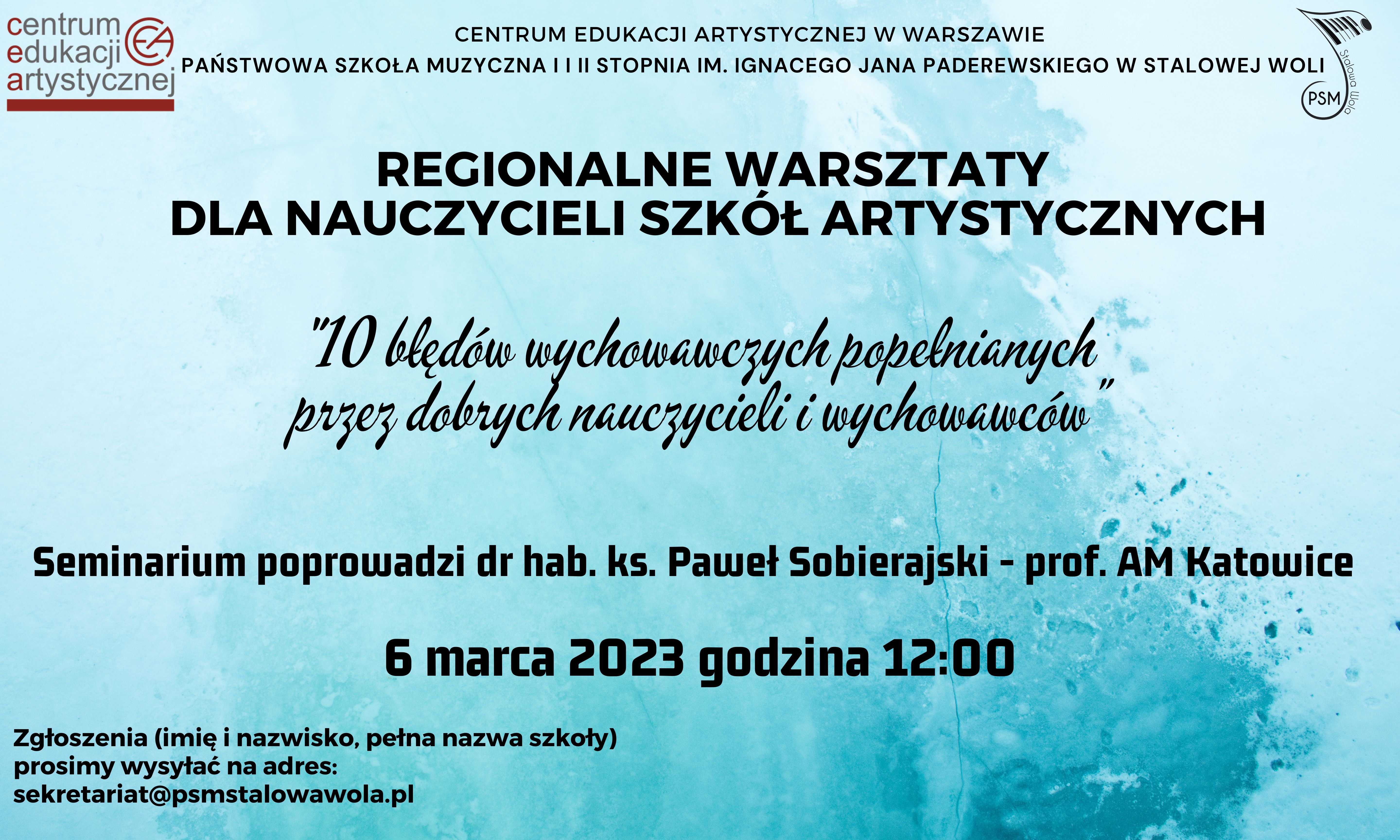 Centrum Edukacji Artystycznej w Warszawie oraz Państwowa Szkoła Muzyczna I i II stopnia im. Ignacego Jana Paderewskiego w Stalowej Woli serdecznie zapraszają na Regionalne warsztaty dla Nauczycieli Szkół Artystycznych "10 błędów wychowawczych popełnianych przez dobrych nauczycieli i wychowawców" - 6 marca 2023 r. godz. 12:00 . Seminarium poprowadzi dr hab. ks. Paweł Sobierajski z Akademii Muzycznej w Katowicach.