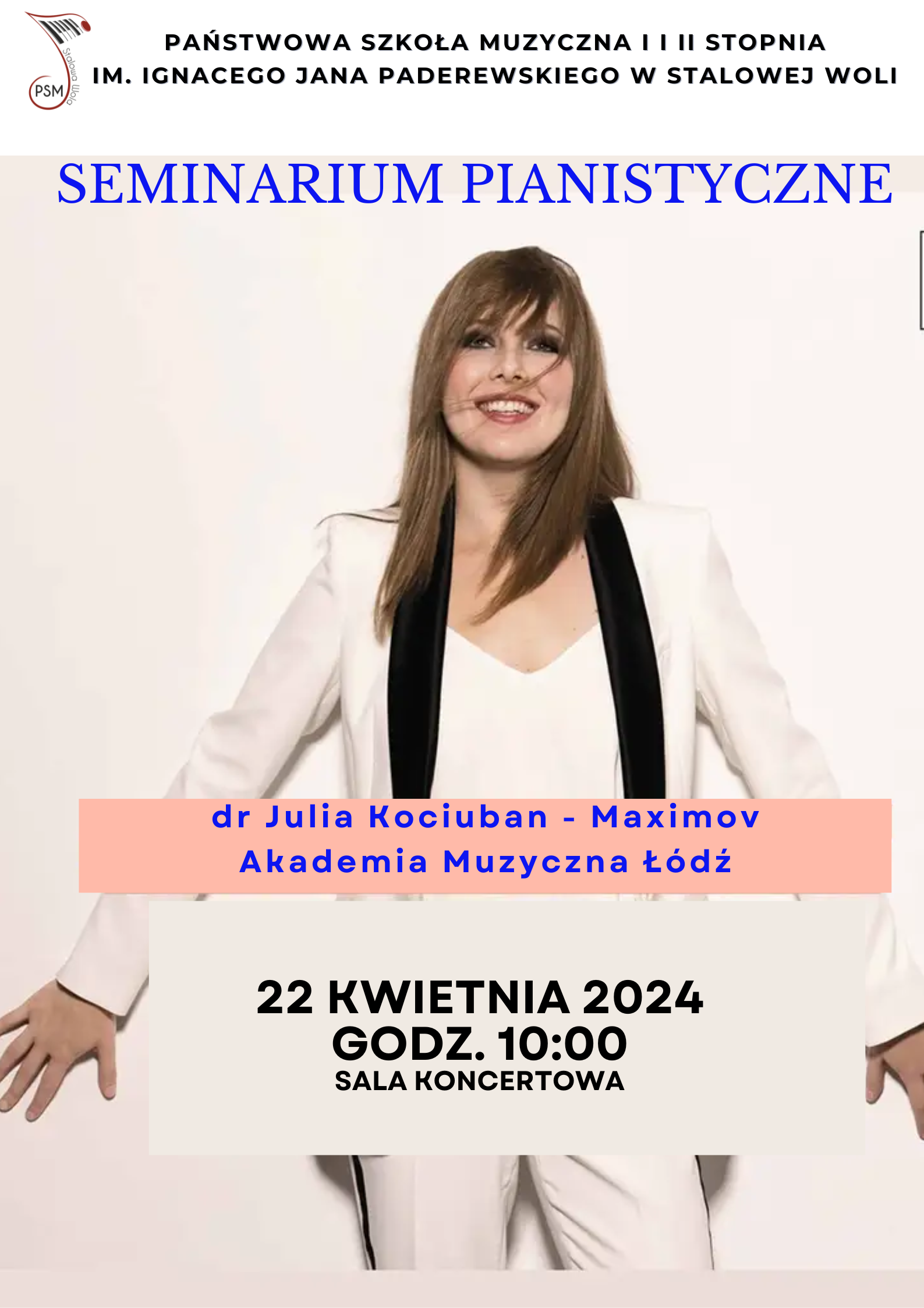 Seminarium pianistyczne dr Julia Kociuban-Maximov 22 kwietnia 2024 18.04.2024 Serdecznie zapraszamy Zdjęcia (1) Pokaż zdjęcie 1 z galerii.