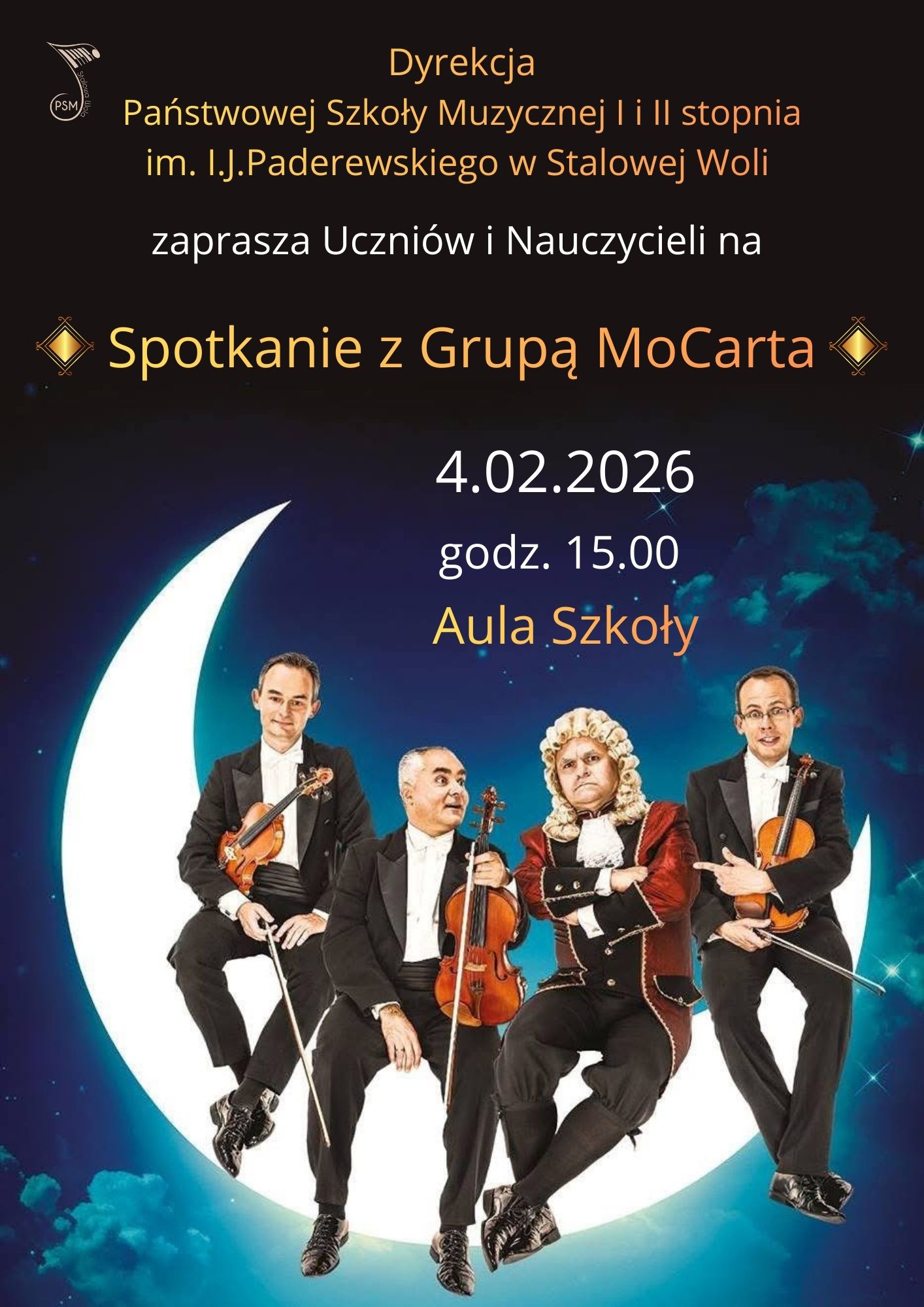 Państwowa Szkoła Muzyczna I i II stopnia im. I. J. Paderewskiego w Stalowej Woli zaprasza uczniów i nauczycieli na spotkanie z Grupą MoCarta.